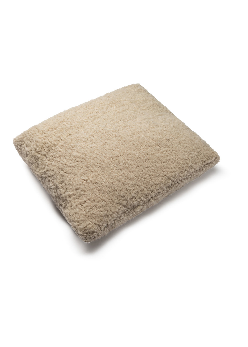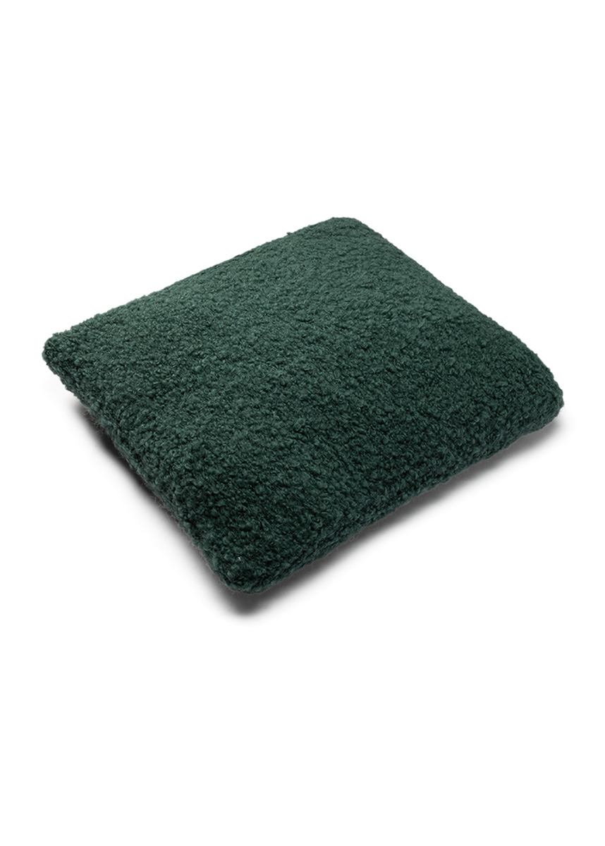 Lana Grossa-garen ‘Orsetto’ (60% scheerwol (merino), 40% alpaca (superfijn), ca. 75 m/50 g): ca. 200 g greige (kl 7) en petrolgroen (kl 9); breinld 6 mm; 2 wasbare kussenvullingen, 50 x 50 cm.