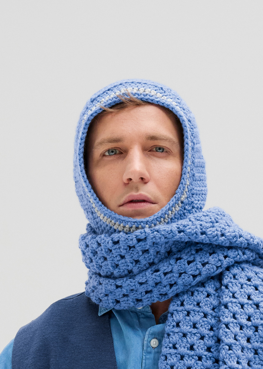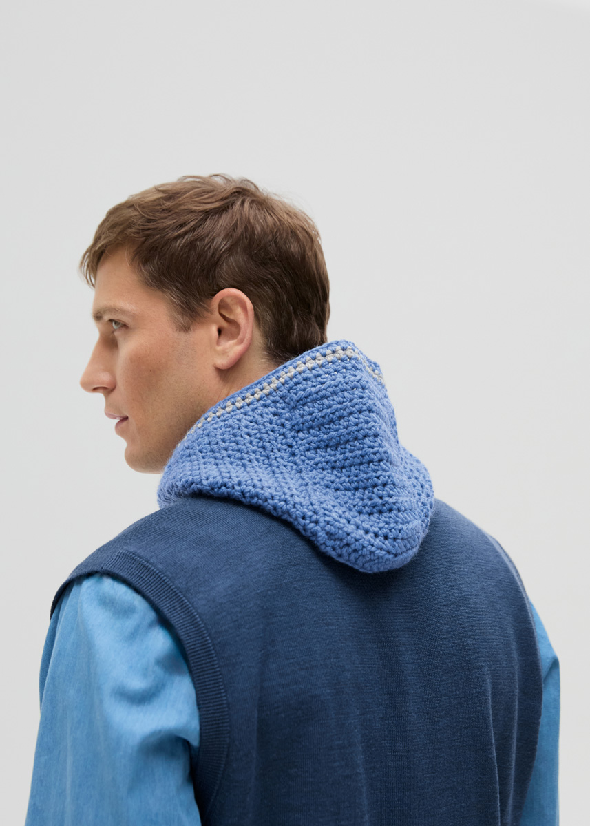 Lana Grossa ‘Cool Merino Big’ (90% scheerwol (merino), 10% polyamide, ca. 90 m/50 g): 100 g azuurblauw (kl 233), 50 g lichtgrijs (kl 218); haaknld 7 mm; markeerringen