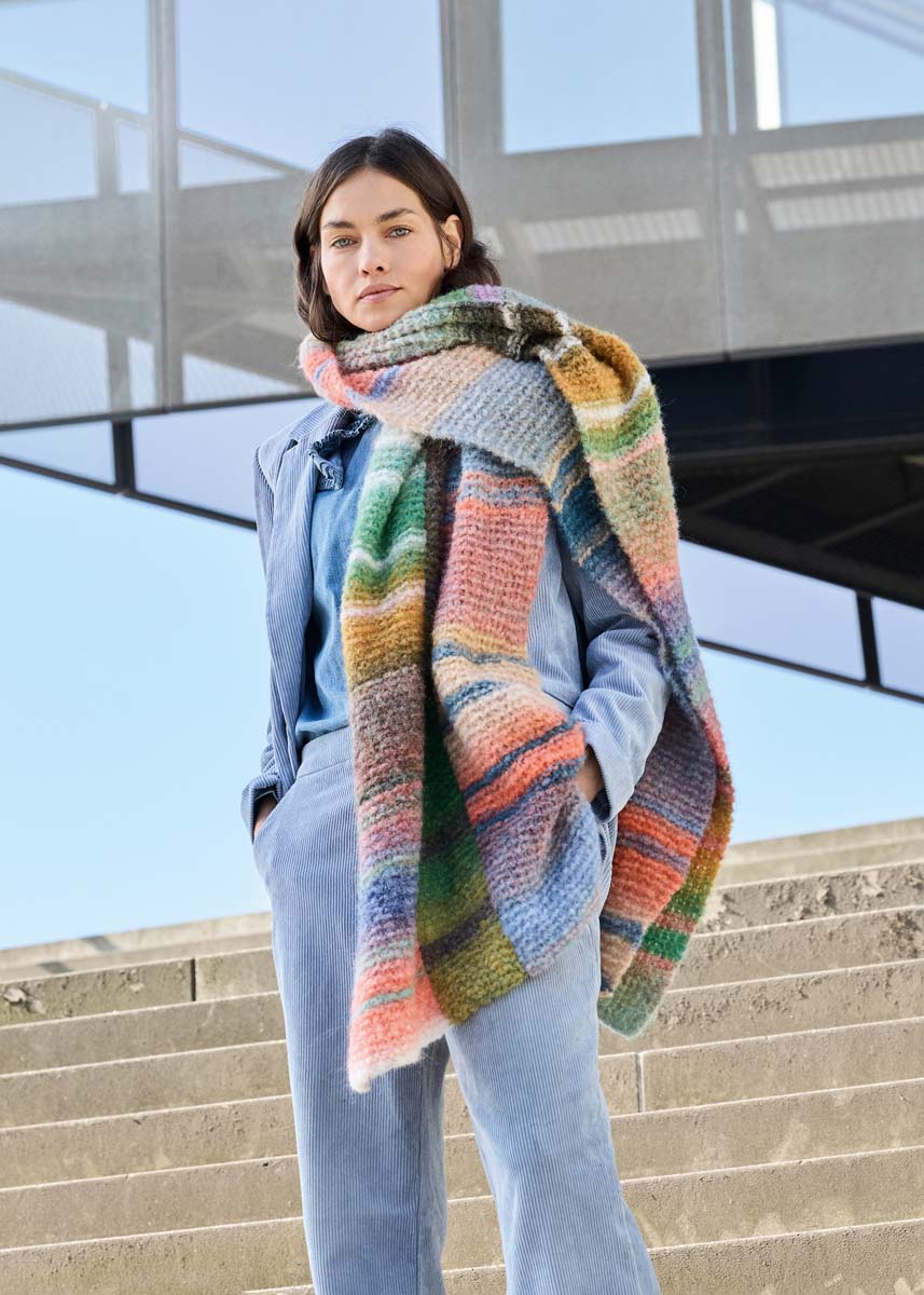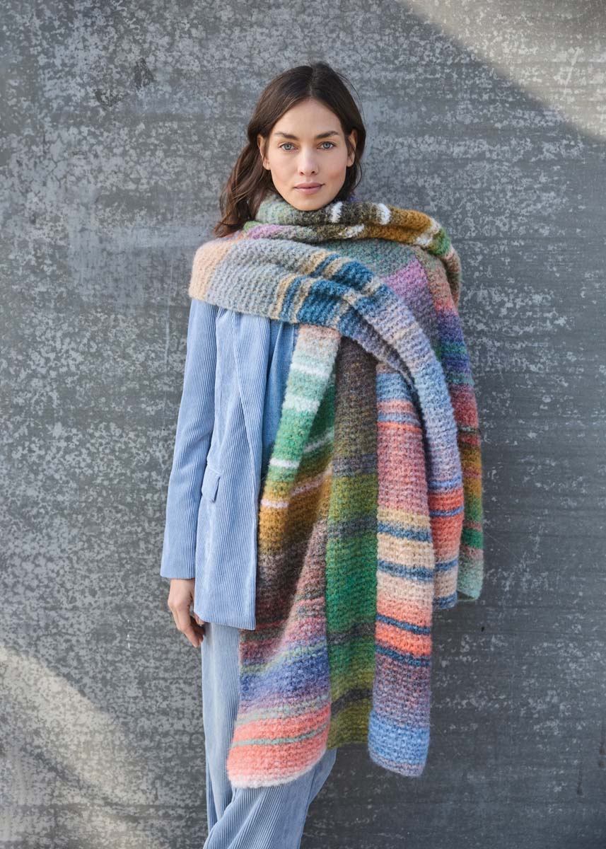 Lana Grossa-garen ‘Gigante Multi’ (70% alpaca (fijn), 30% polyamide, ca. 150 m/50 g): ca. 100 g grijsblauw/beige/grijsrood/ mandarijn/petrolgroen/grijsgeel (kl 101), ca. 100 g grijsgroen/roodviolet/ donkerjeans/geelorange/geraniumroze/olijf/mosgroen (kl 105) en 100 g donker-/lichtolijf/roze/grijsgroen/groen/braam/antiekviolet (kl 106); breinld 6,5 mm
