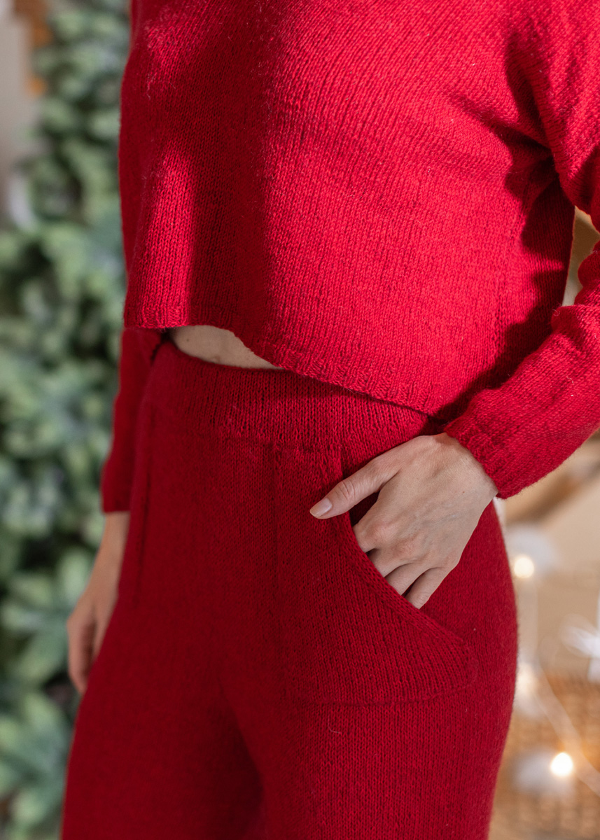 De broek wordt in één stuk van boven naar beneden in toeren gebreid. De zakken worden apart gebreid en achteraf opgenaaid. Het model heeft (hangend gemeten) een binnenbeenlengte van 82 (81 - 80 - 79 - 78 - 77) cm, een tailleomvang van 62 (70 - 78 - 86 - 98 - 110) cm, een bovenbeenomvang van 56 (61 - 66 - 71- 78 - 85) cm en een heupomvang van 86 (94 - 102 - 110 - 122 - 134) cm.