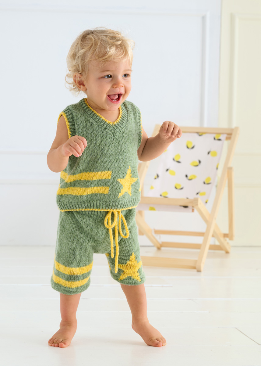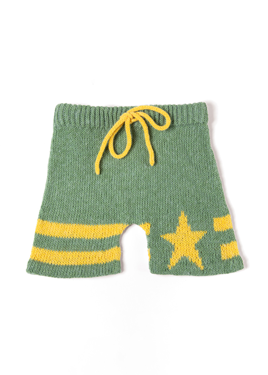 Lana Grossa Ecopuno (72% katoen, 17% scheerwol (merino), 11% alpaca (baby); ca. 215 m/50 g): 50 (50/100/100) g resedagroen (kl 20) en 50 g geel (kl 95); rondbreinld 3,5 mm en 4 mm; markeerringen; 44 (48/52/56) cm elastiek, 3 cm breed.
