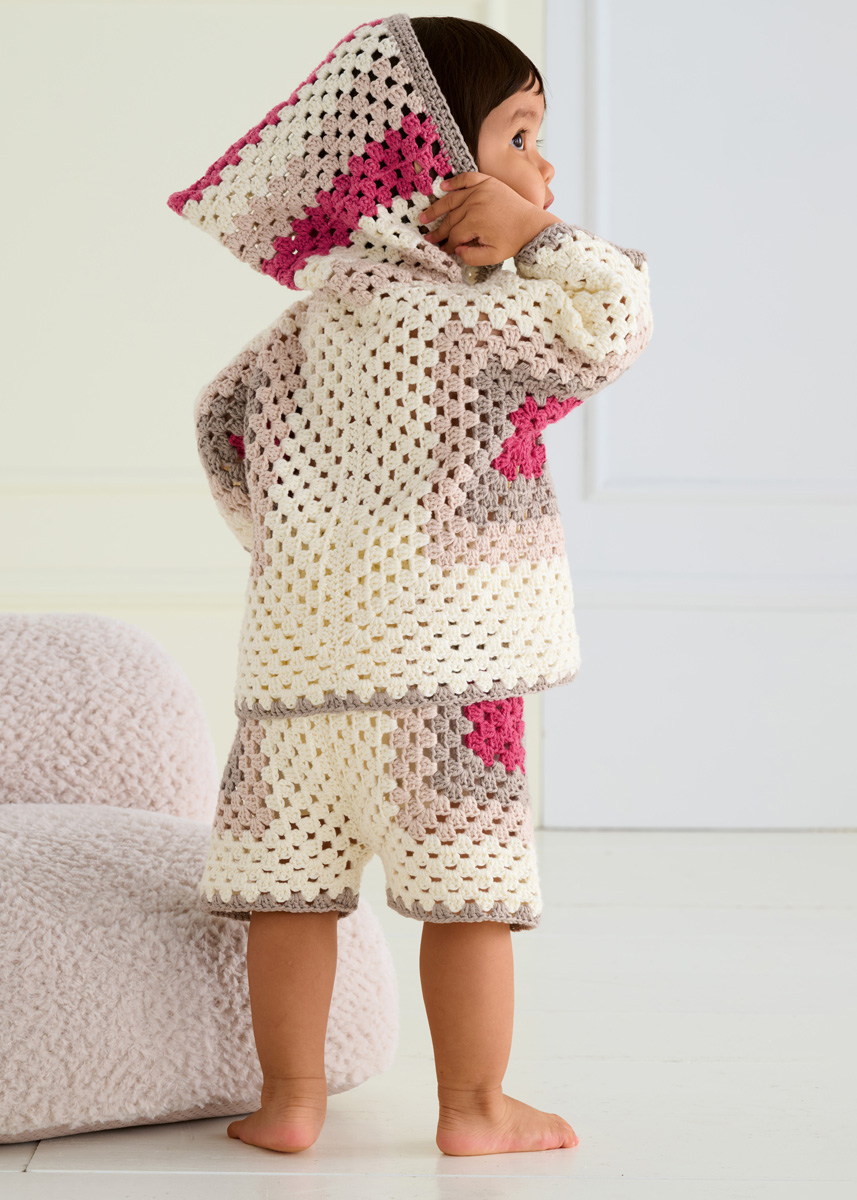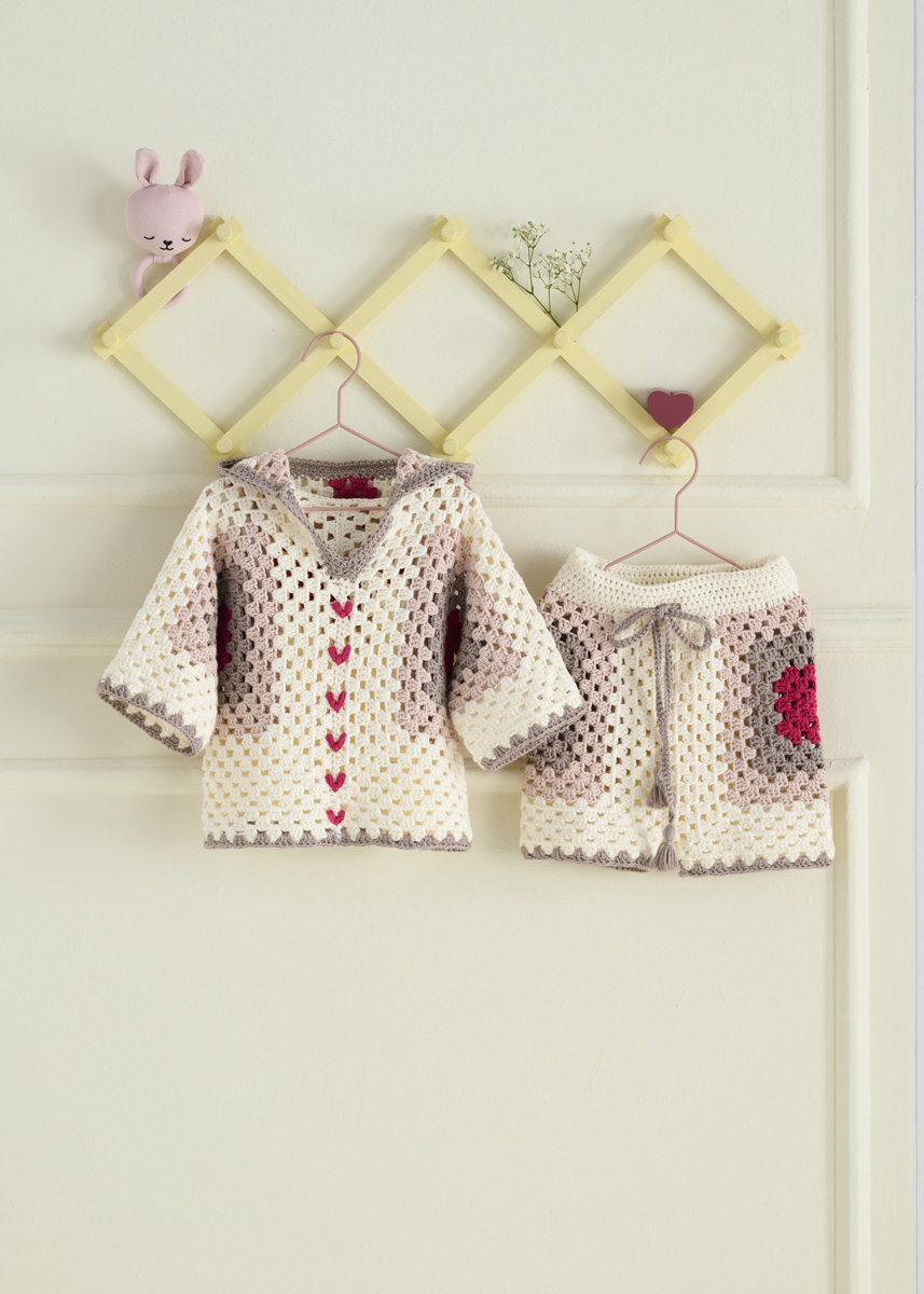 Lana Grossa Soft Cotton (70% katoen, 30% polyacryl; ca. 140 m/50 g): 50 (100/100/100) g ecru (kl 2) en 50 g beige (kl 3), felroze (kl 63) en grijsbeige (kl 4); haaknld 4 mm; markeerringen (alternatief: veiligheidsspelden); 42 (46/50/54) cm elastiek, 3 cm breed.