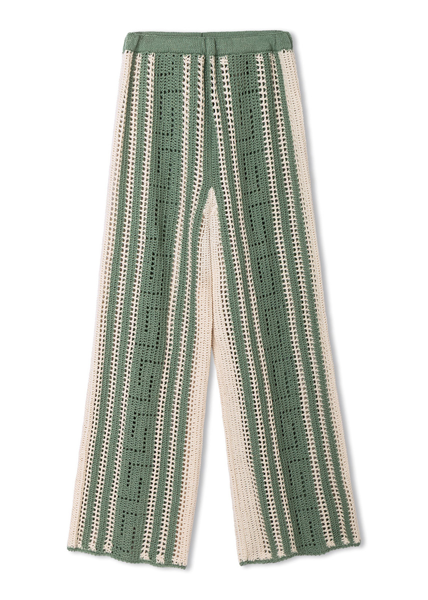 Lana Grossa-garen ‘Summer Cashmere’ (90% katoen, 10% kasjmier, ca. 210 m/50 g): ca. 300 g crème (kl 2) en ca. 200 g resedagroen (kl 23); 1 haaknld 3 mm; 1 rondbreinld 3 mm, 60 cm lang; ca. 65 cm wit elastisch band, 2 cm breed.