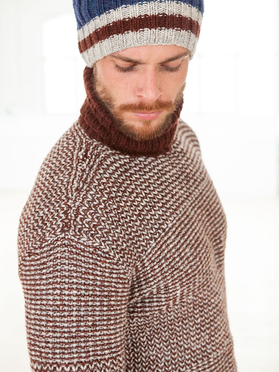 “Alta Moda Alpaca” (90% alpaca, 5% scheerwol, 5% polyamide, looplengte 140 m/50 g) van Lana Grossa: 350 (400/450) g roodbruin gem.leerd (kl. 41) en 300 (350/400) g gr.ge (kl. 21); breinaalden nr. 6 en 7, een 40 cm lange rondbreinaald nr. 6.