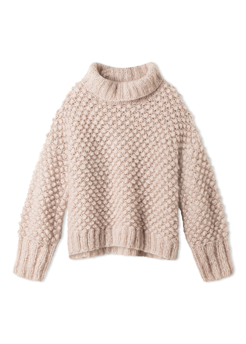 Lana Grossa-garen ‘Mohair Moda’ (70% mohair (kid mohair), 20% scheerwol (merino superfijn), 10% polyamide, ca. 140 m/50 g): ca. 600 (650 – 700) g beige (kl 11); breinld 7 mm en 10, 1 rondbreinld 7 mm en 10, 60 cm lang, breinld zonder knop 7 mm.