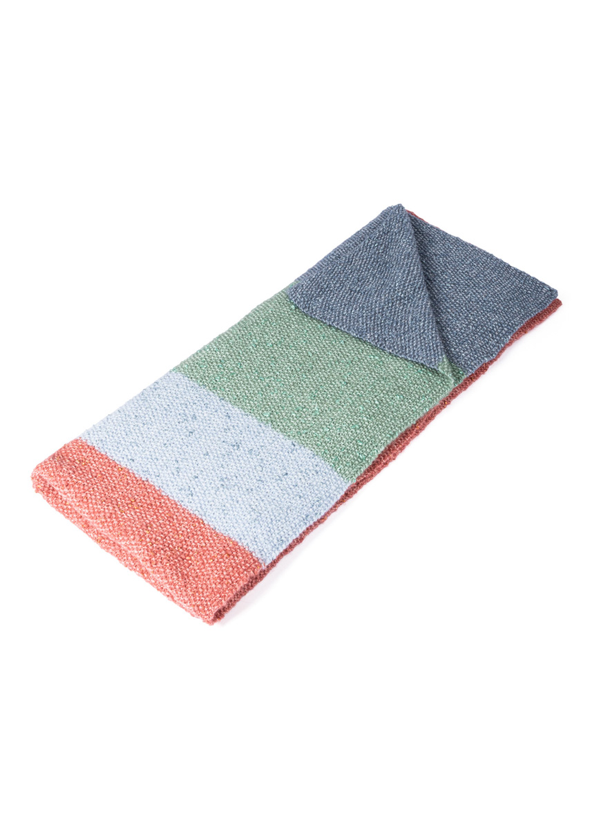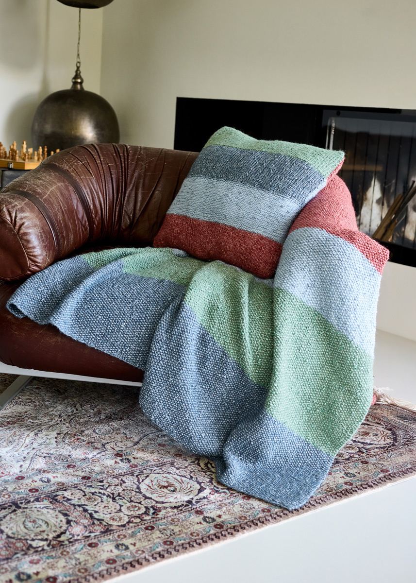 Lana Grossa-garen ‘Lucciola’ (29% polyamide, 24% scheerwol (merino Fine), 22% viscose, 20% (baby) alpaca, 5% metaalvezels, ca. 130 m/50 g): ca. 500 g terracotta (kl 9), ca. 150 g groen (kl 3) en lichtblauw (kl 5) en ca. 100 g grijsblauw (kl 4); 1 rondbreinld 5 mm, 120 cm lang.