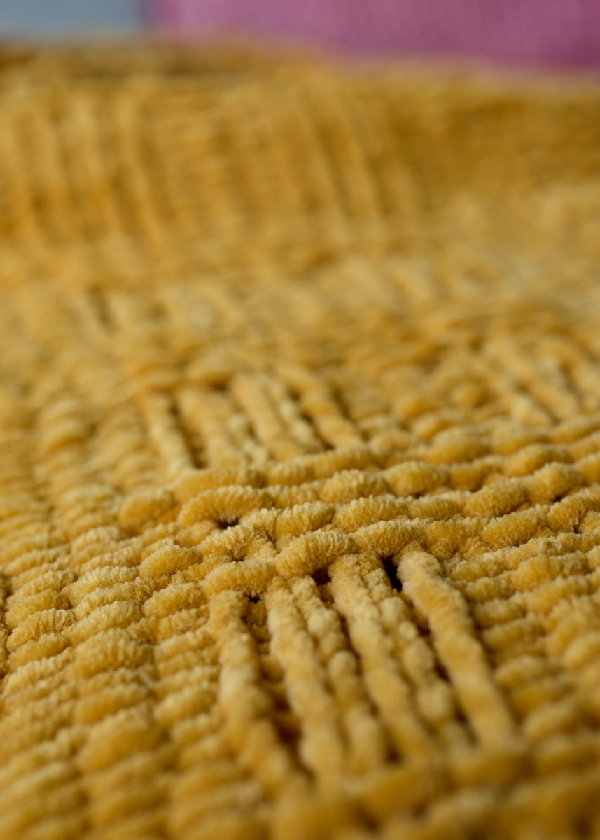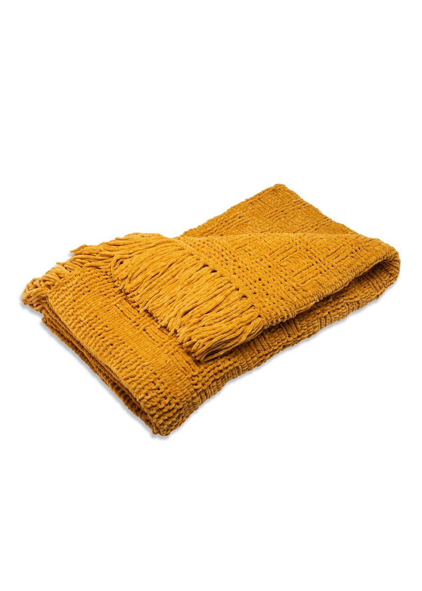 Lana Grossa-garen ‘The Look’ (100% polyester, ca. 120 m/100 g): ca. 1100 g saffraangeel (kl 32); 1 rondbreinld 7 mm, 120 cm lang, 1 haaknld 8 mm voor het vastzetten van de franjes.