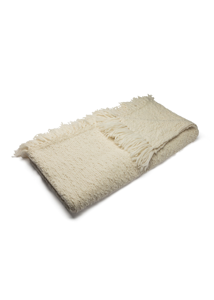 Lana Grossa-garen ‘Caramella’ (53% scheerwol (merino), 25% (baby) alpaca, 22% polyamide, ca. 110 m/50 g): ca. 950 g wit (kl 11); 1 rondbreinld 5,5 mm, 120 cm lang, 1 haaknld 7 mm voor het vastzetten van de franjes.