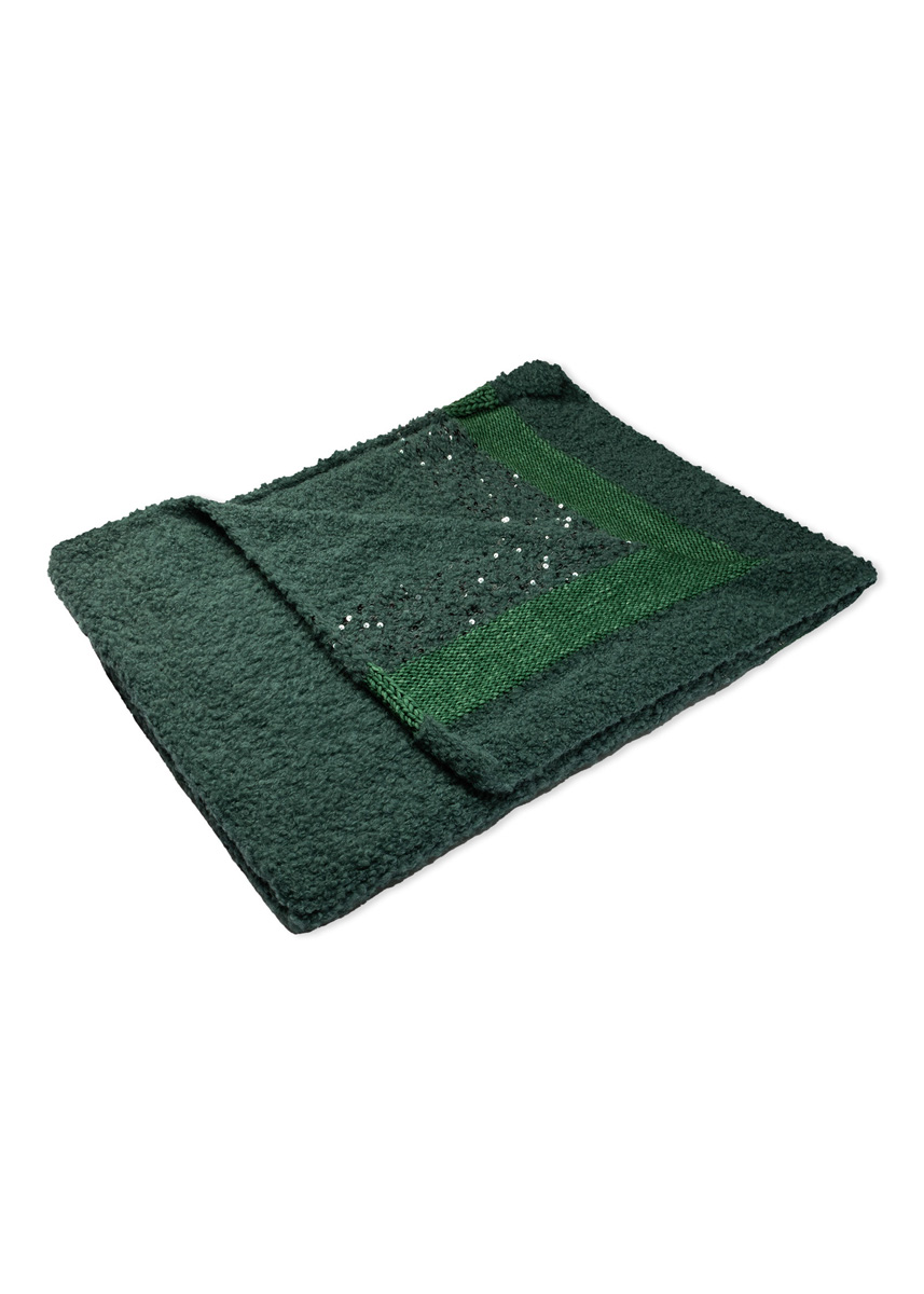 Lana Grossa-garen ‘Orsetto’ (60% scheerwol (merino), 40% alpaca (superfijn), ca. 75 m/50 g): ca. 600 g petrolgroen (kl 9), Lana Grossa-garen ‘Vintage Superchunky’ (100% scheerwol (merino), ca. 80 m/100 g): ca. 200 g opaalgroen (kl 518) en Lana Grossa-garen ‘Cosmo’ (100% katoen (plus pailletten), ca. 260 m/100 g): ca. 100 g grijs (kl 3); 1 rondbreinld 6 mm, 120 cm lang.
