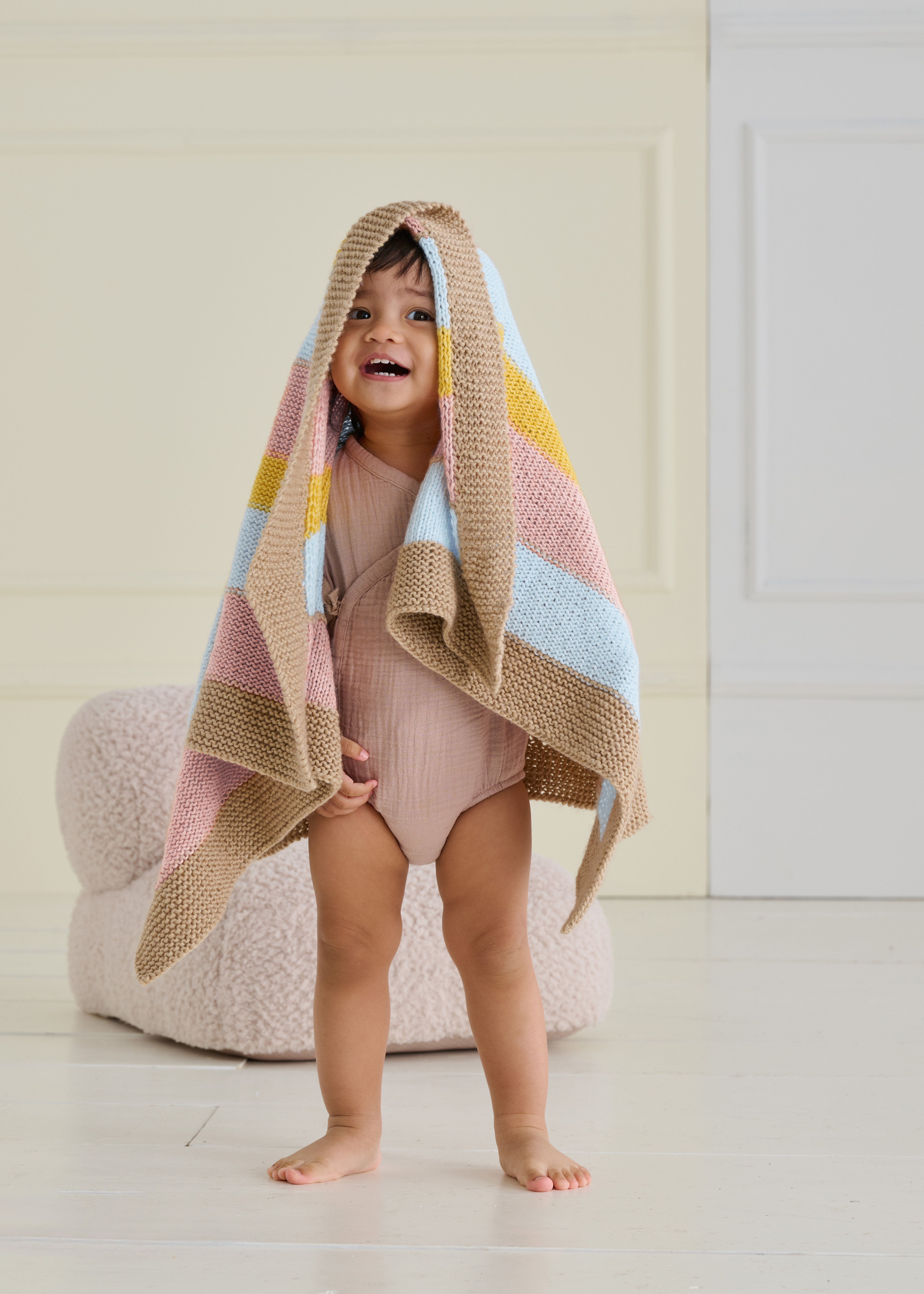 Lana Grossa Summer Softness (80% katoen (bio), 20% scheerwol (merino superfijn); ca. 130 m/50 g): 150 g beige (kl. 3) en 100 g pastelblauw (kl. 17), geel (kl. 11) en pastelroze (kl. 10); rondbreinld 5 mm; haaknld 6 mm.