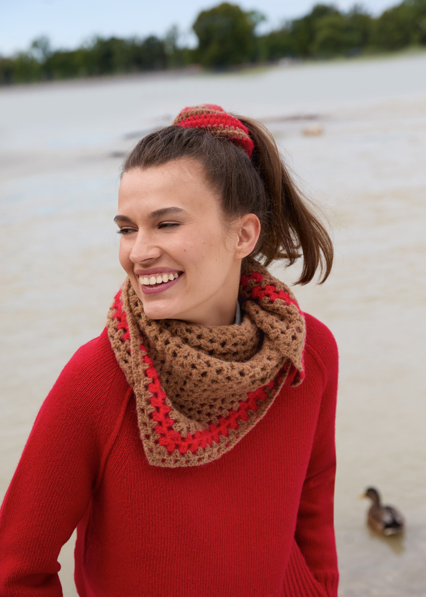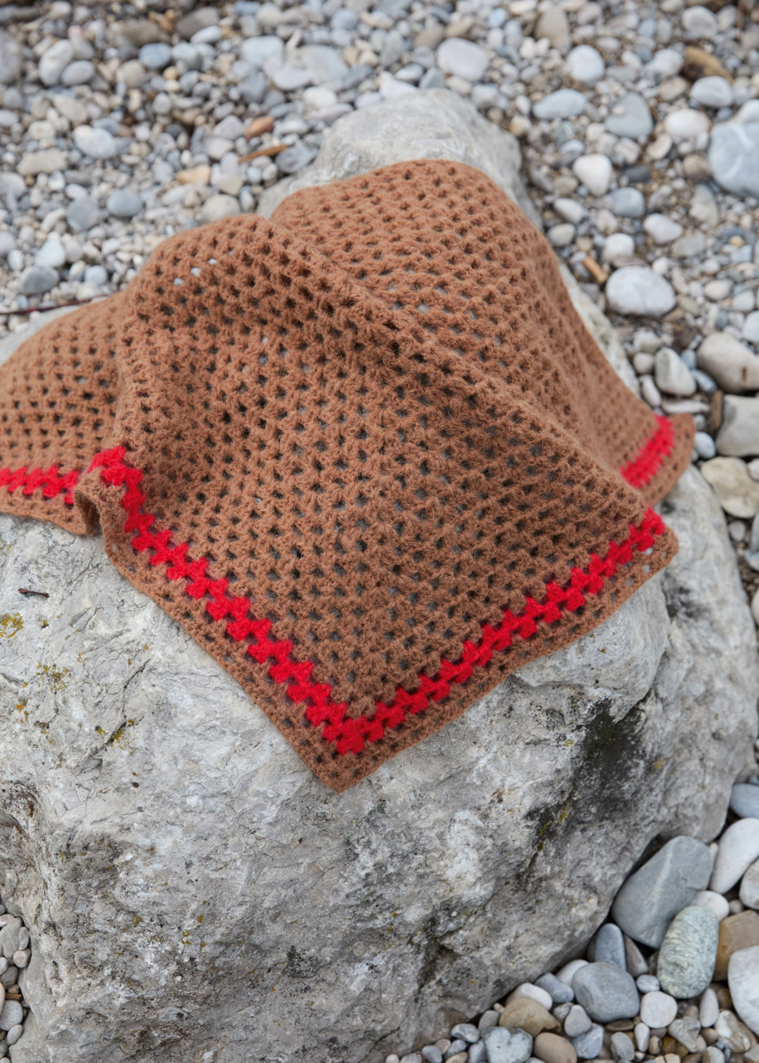 Lana Grossa ‘Nebbia’ (55% scheerwol (merino extrafijn), 45% (baby) alpaca, ca. 170 m/50 g): 100 g felrood (kl 2) en camel (kl 12); 1 haaknld 4,5 mm.