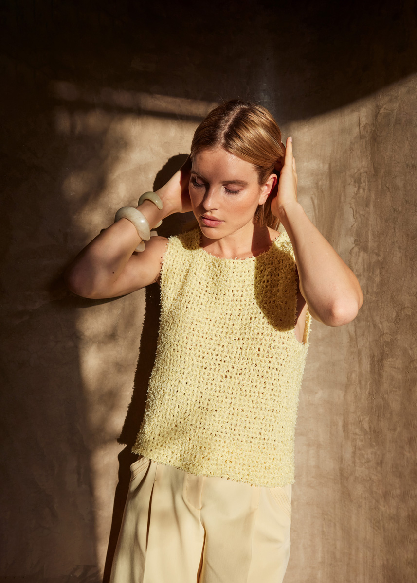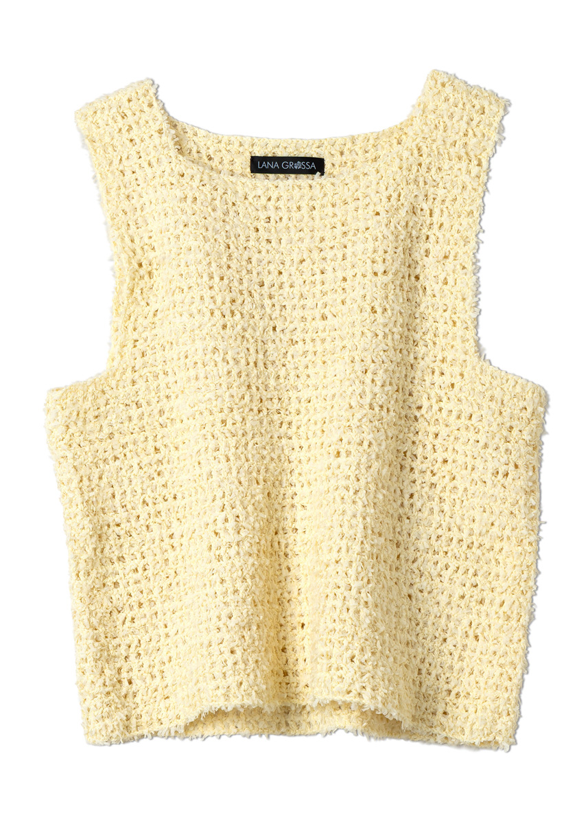 Lana Grossa Frizzante (54% katoen, 46% polyamide, ca. 105 m/50 g), 250 (250 - 300 - 350) g in vanille (kl 11). 1 haaknld 3,5 mm.