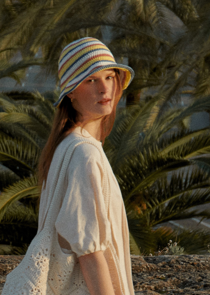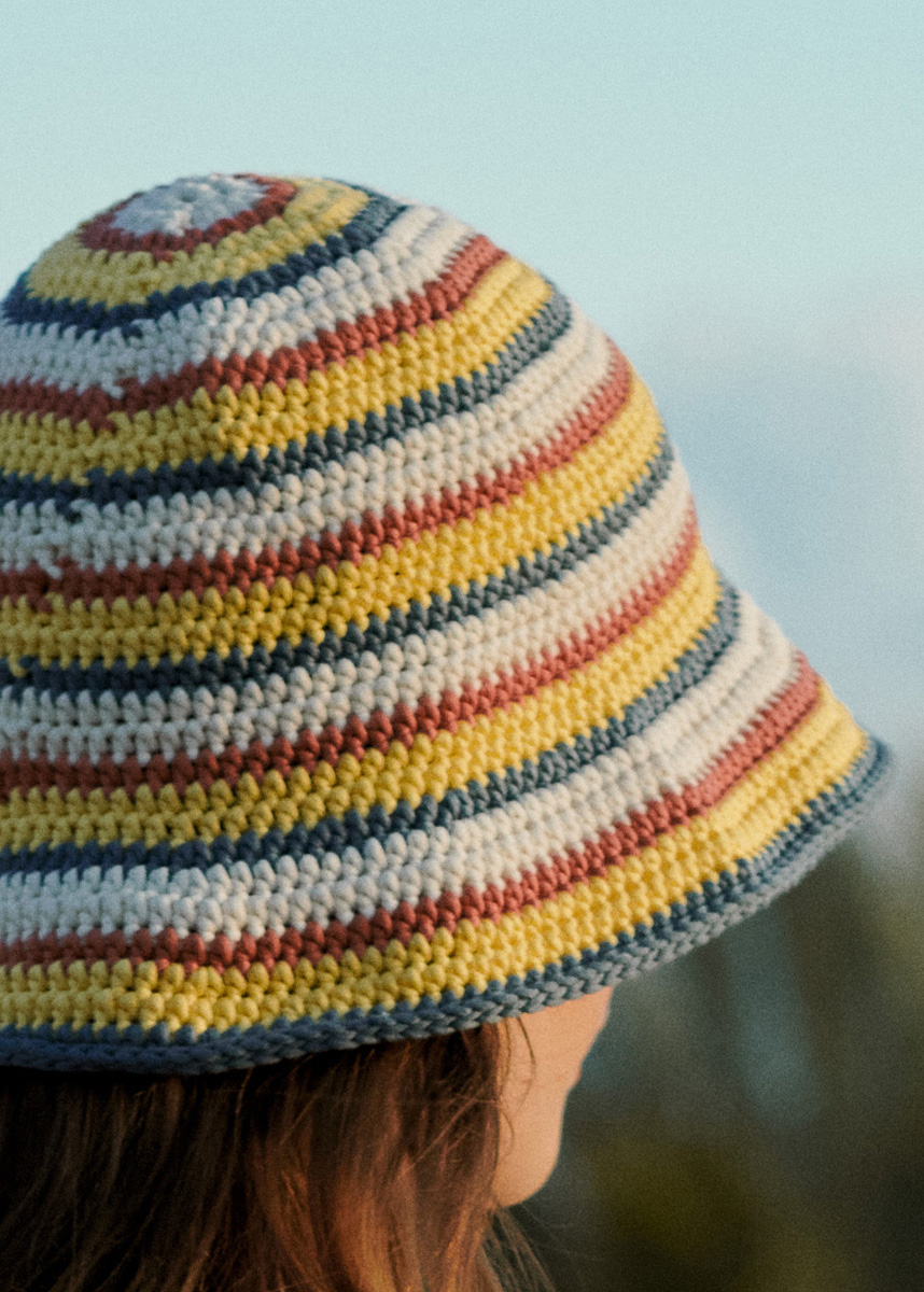 „Riserva“ (70% katoen (bio), 30% gerec. polyamide, ll. = ca. 125 m/50 g) van Lana Grossa: telk. 50 g ecru (kl. 2), geel (kl. 28), dakpanrood (kl. 30) en jeans (kl. 23); 1 haaknaald nr. 4