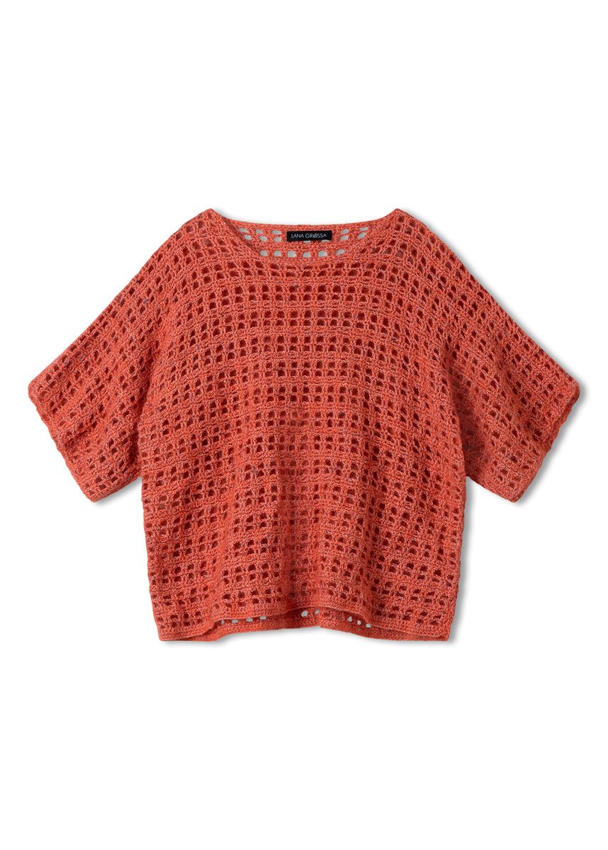 Lana Grossa Filo Paillettes (55% katoen, 39% polyester, 6% polyamide, ca. 155 m/50 g), 400 (450 - 500 - 500) g in zalm (kl 6), Lana Grossa Natural Superkid Tweed (60% mohair (superkid), 30% zijde, 7% katoen, 3% polyester, ca. 200 m/25 g), 175 (200 - 200 - 225) g in zalm (kl 627), 1 haaknld 4,5 mm.