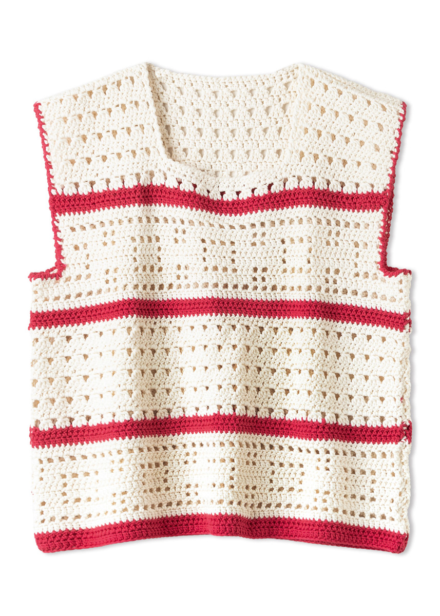 Lana Grossa-garen ‘Promessa’ (70% katoen (bio), 30% polyamide (recycled), ca. 125 m/50 g): ca. 250 (350) g crème (kl 14) en ca. 50 (100) g Oriëntaals rood (kl 1); haaknld 5 mm.