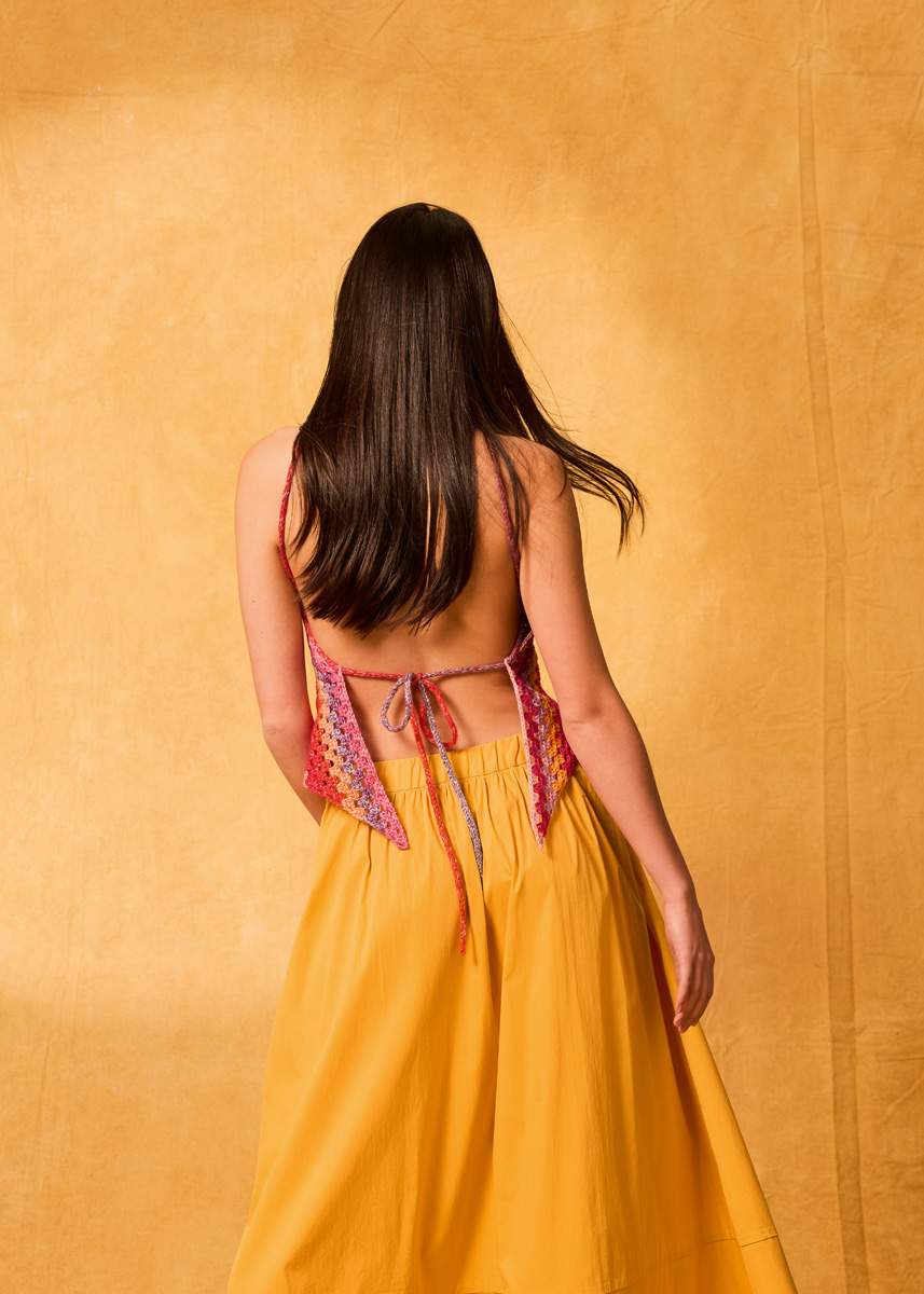 Lana Grossa-garen ‘Cotonella’ (100% katoen (Pima), ca. 280 m/100 g): ca. 1 bolletje = ca. 100 g camel/ felroze/fuchsia/roodviolet/grijs/sering/geelorange/rood/geel (kl 19); 1 haaknld 4,5; 2 breinld zonder knop 4 mm