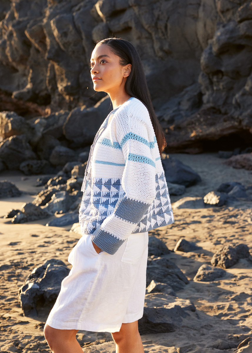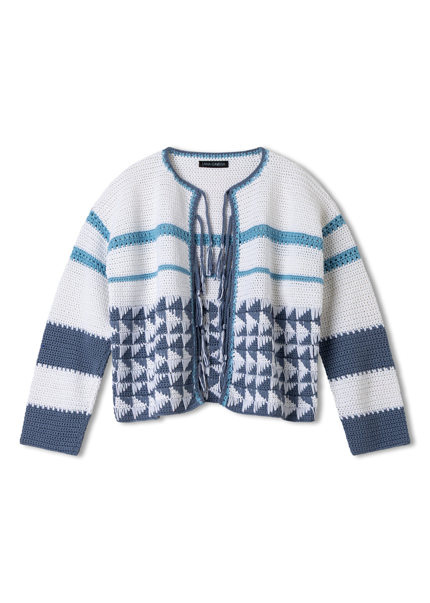 Lana Grossa Tessera (100% katoen, ca. 115 m/50 g), 500 (550 - 600) g in wit (kl 20), 250 (300 - 350) g in jeans (kl 12), 100 g in hemelsblauw (kl 13). 1 haaknld 4,5 mm.