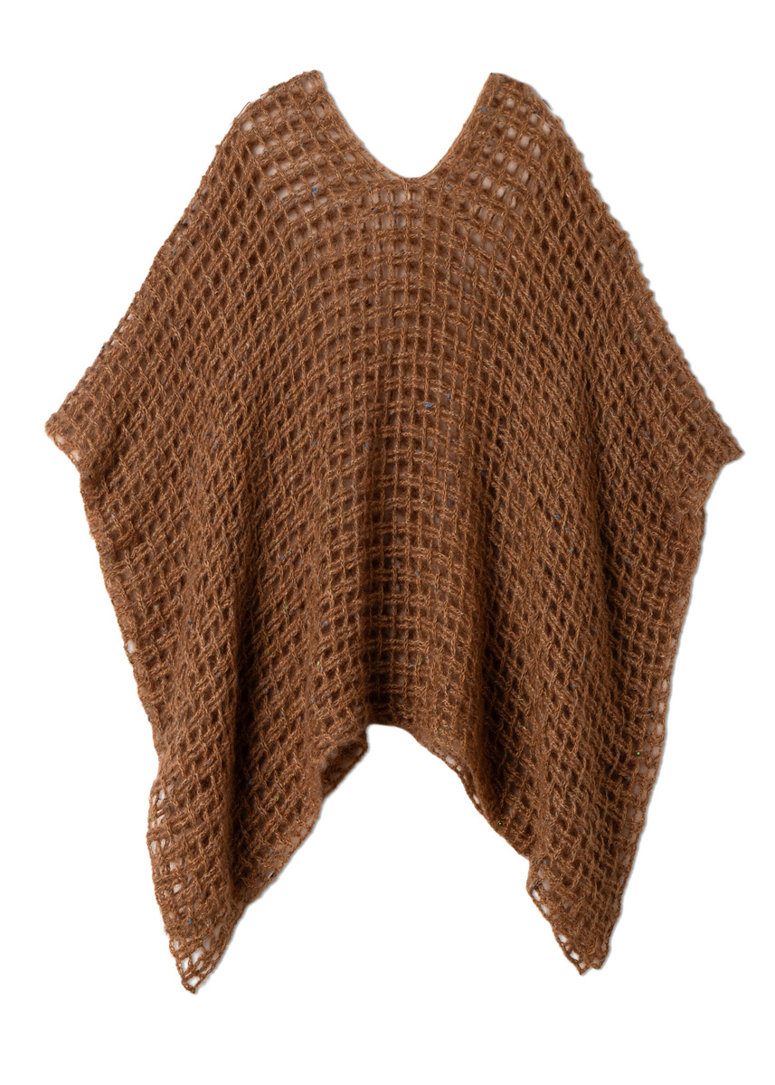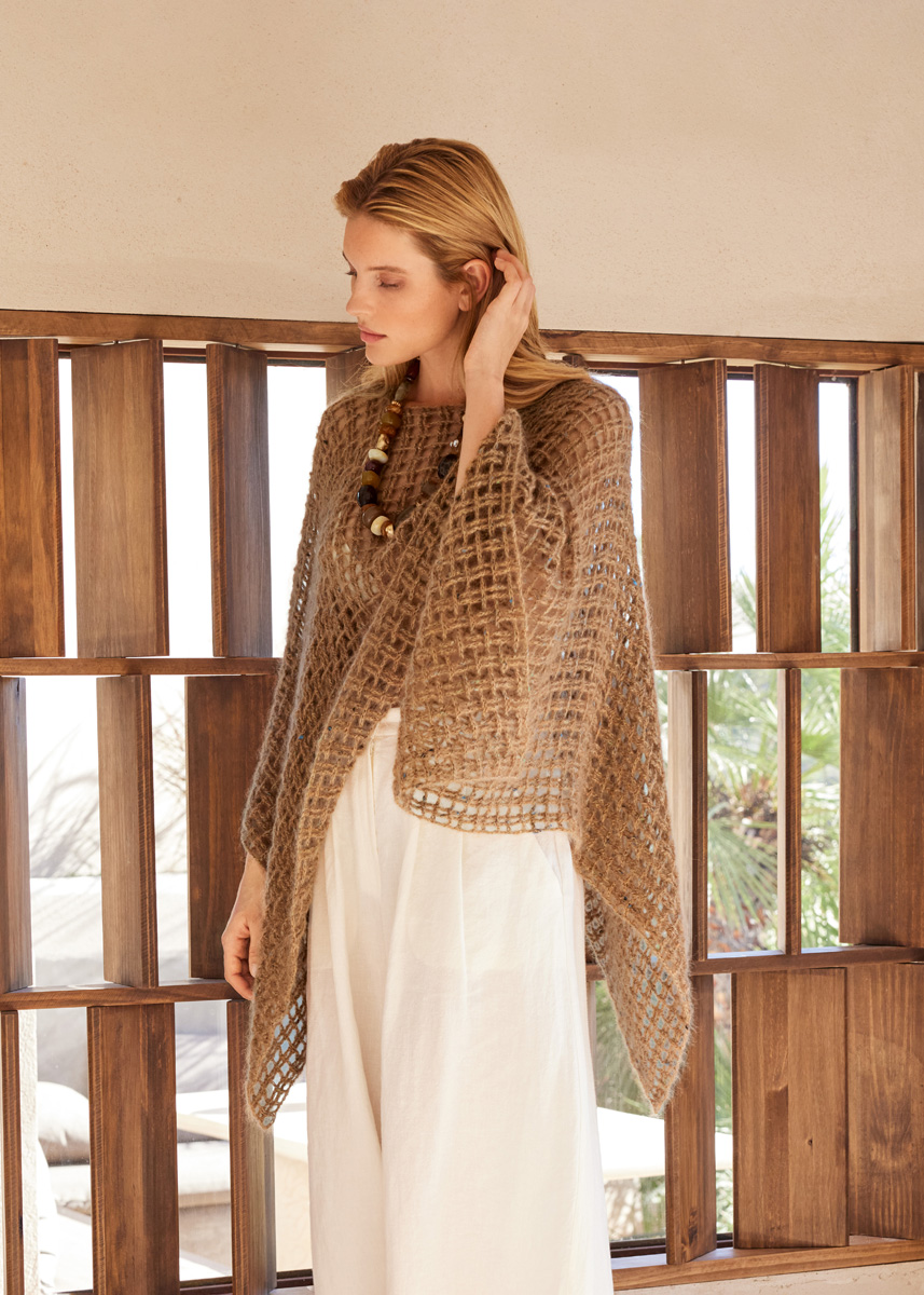 Lana Grossa Natural Superkid Tweed (60% mohair, (superkid), 30% zijde, 7% katoen, 3% polyester, ca. 200 m/25 g), 275 (350) g in camel (kl 620). 1 haaknld 4,5 mm.