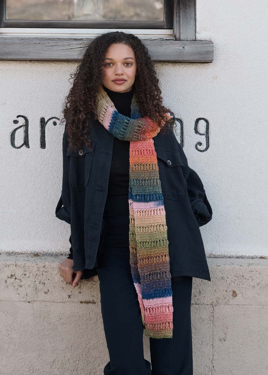 Gomitolo Fumo van Lana Grossa (50% scheerwol, 50% polyacryl, LL=ca 700 m/200 g): 1 klw. = 200 g zachtroze/abrikoos/oranje/geel/groengrijs/oker/petrol (kl. 515). Haaknld. nr. 5.
