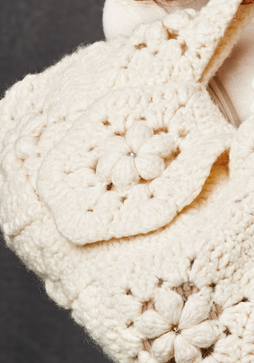 ca. 350 g "Feltro (100% scheerwol, ll. = 50 m/50 g) van Lana Grossa in natuurwit (kl. 1); 1 haaknld. nr. 8; 1 paar bamboe-hengsels van PRYM, art. 615 109, 10 transparante facettekralen, ca. 6 mm ø.