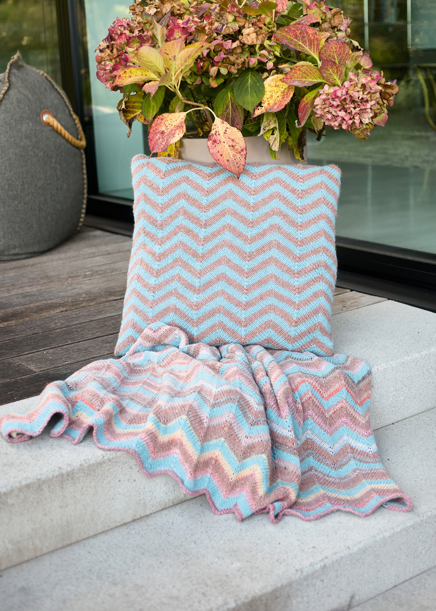 Lana Grossa-garen ‘Gomitolo Intenso’ (50% scheerwol, 50% polyacryl, ca. 700 m/200 g): ca. 400 g lichtgrijs/abrikoos/lichtgeel/ lichtblauw/zachtroze/grijs/greige/perzik (kl 236) en Lana Grossa-garen ‘Brigitte No. 2’ (47% (baby) alpaca, 45% katoen, 8% scheerwol (merino), ca. 140 m/50 g): ca. 200 g turkooisblauw (kl 77) en rozenhout (kl 43); 1 rondbreinld 5 mm, 120 cm lang.