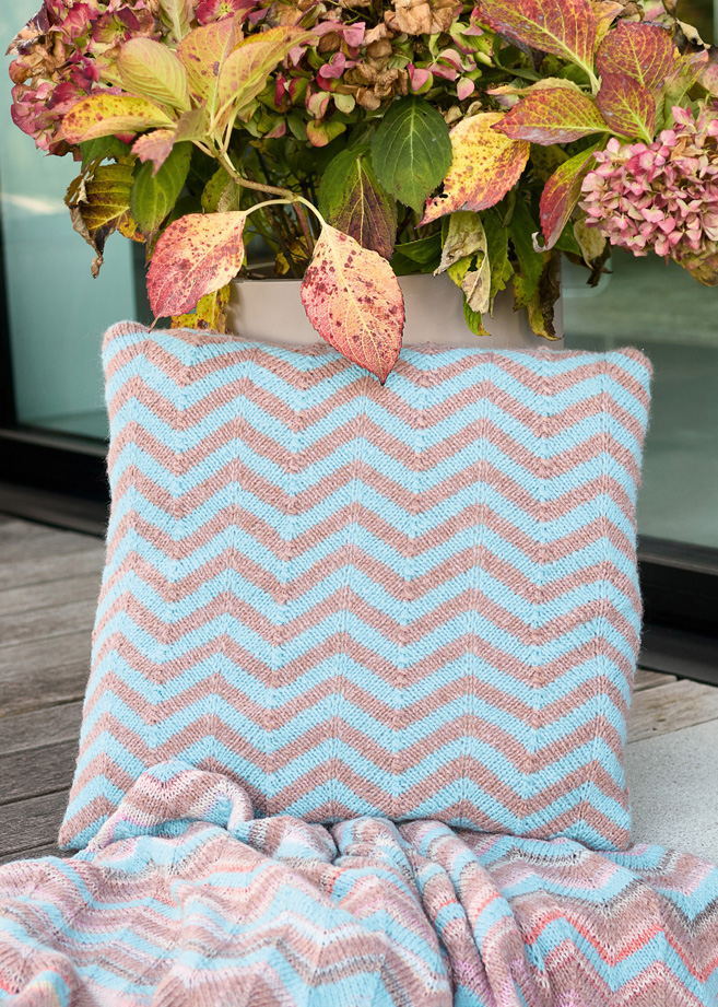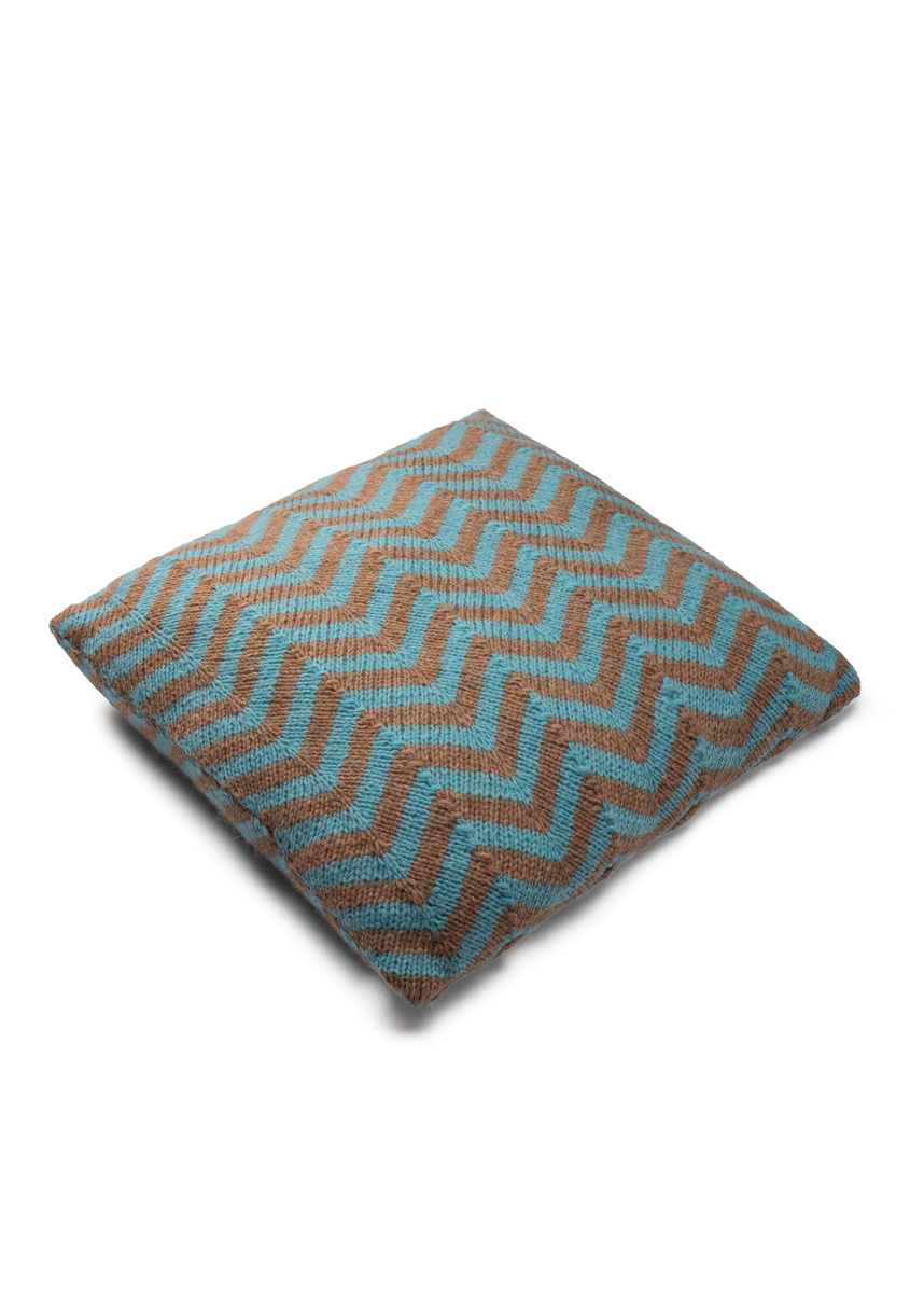 Lana Grossa-garen ‘Brigitte No. 2’ (47% (baby) alpaca, 45% katoen, 8% scheerwol (merino), ca. 140 m/50 g): ca. 100 g turkooisblauw (kl 77) en rozenhout (kl 43); breinld 5 mm; 1 wasbare kussenvulling, 50 x 50 cm.