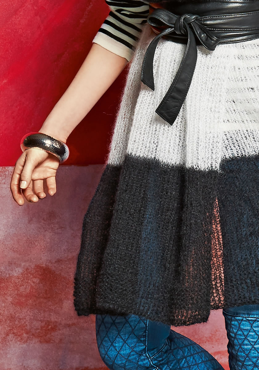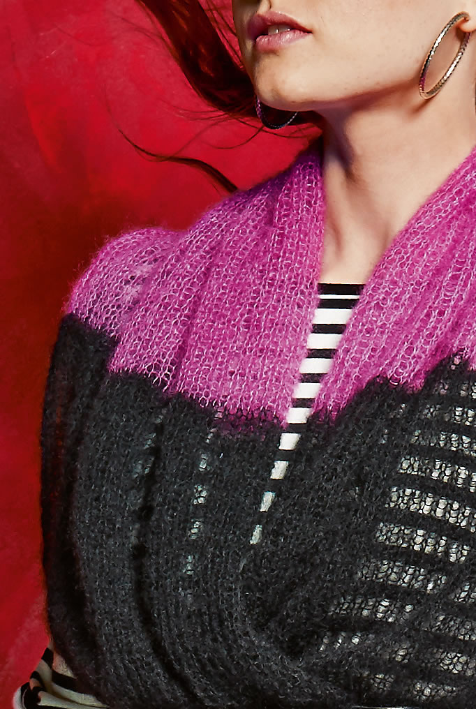 „Silkhair“ (70% mohair (superkid), 30% zijde, ll. = ca. 210 m/25 g) van Lana Grossa: ca. 100 g zwart (kl. 14) en telk. ca. 50 g naturel (kl. 58) en cyclaam (kl. 64); breinld. nr. 7.