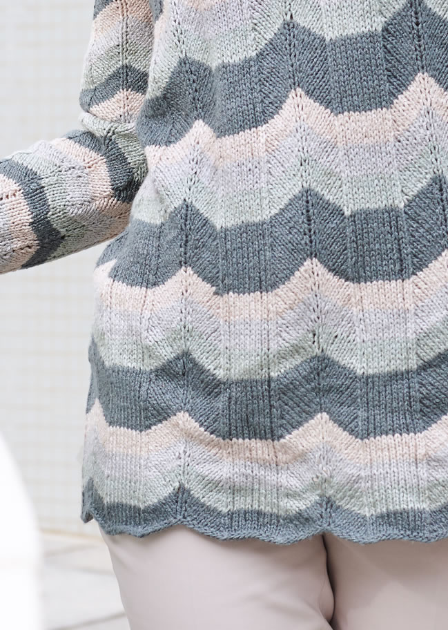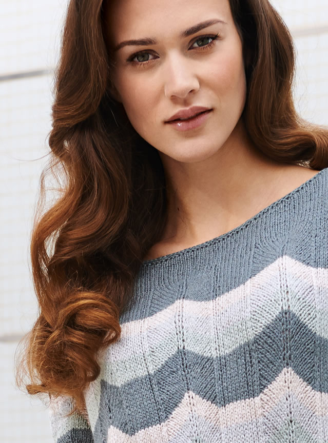 garen van Lana Grossa “Linarte” (40% viscose, 30% katoen, 20% linnen, 10% polyamide, 125 m/50 g), ca. 300 (350) g steengrijs (kl. 64) en ca. 150 (200) g grijsgroen (kl. 61), zilvergrijs (kl. 60) en beige (kl. 62), breinld. nr. 4 en 1 korte rondbreinaald nr. 3,5.