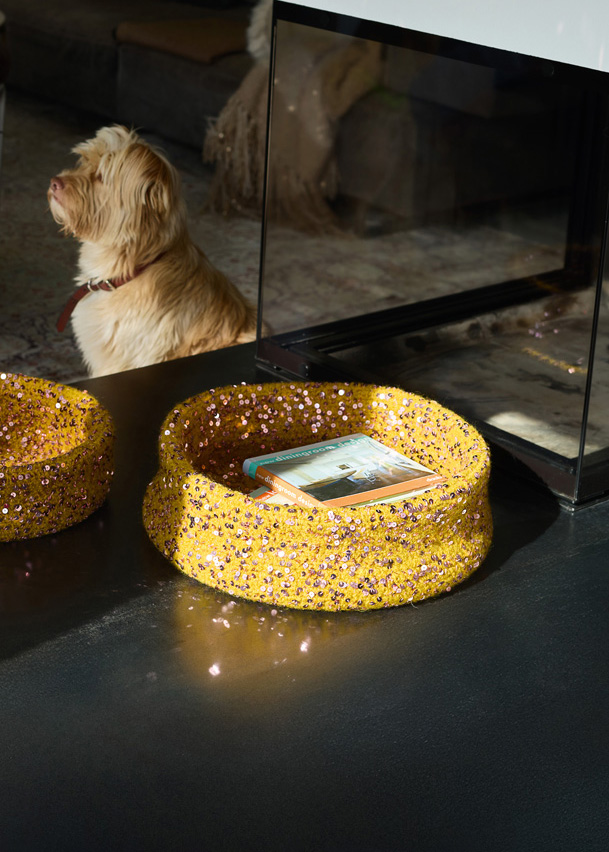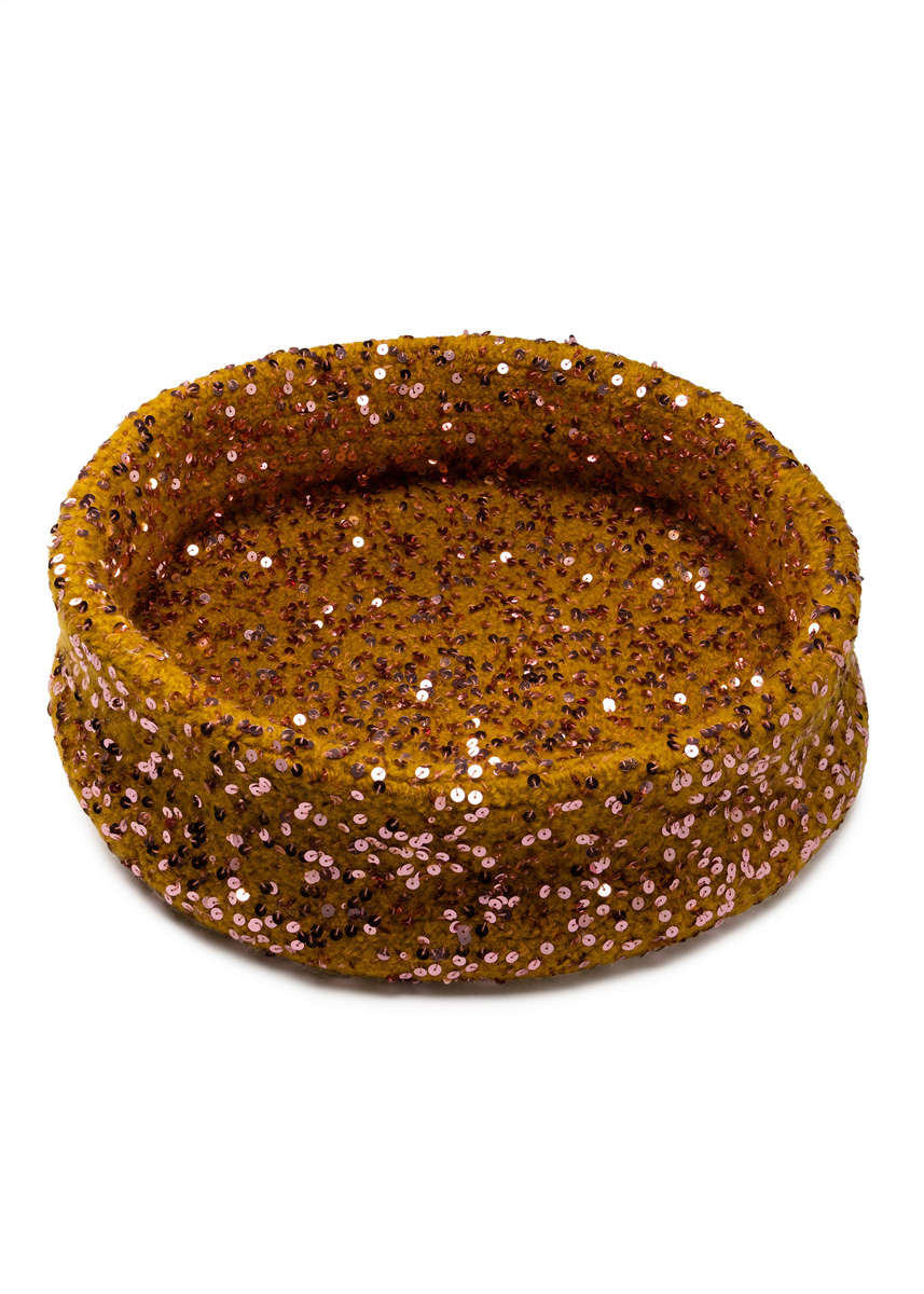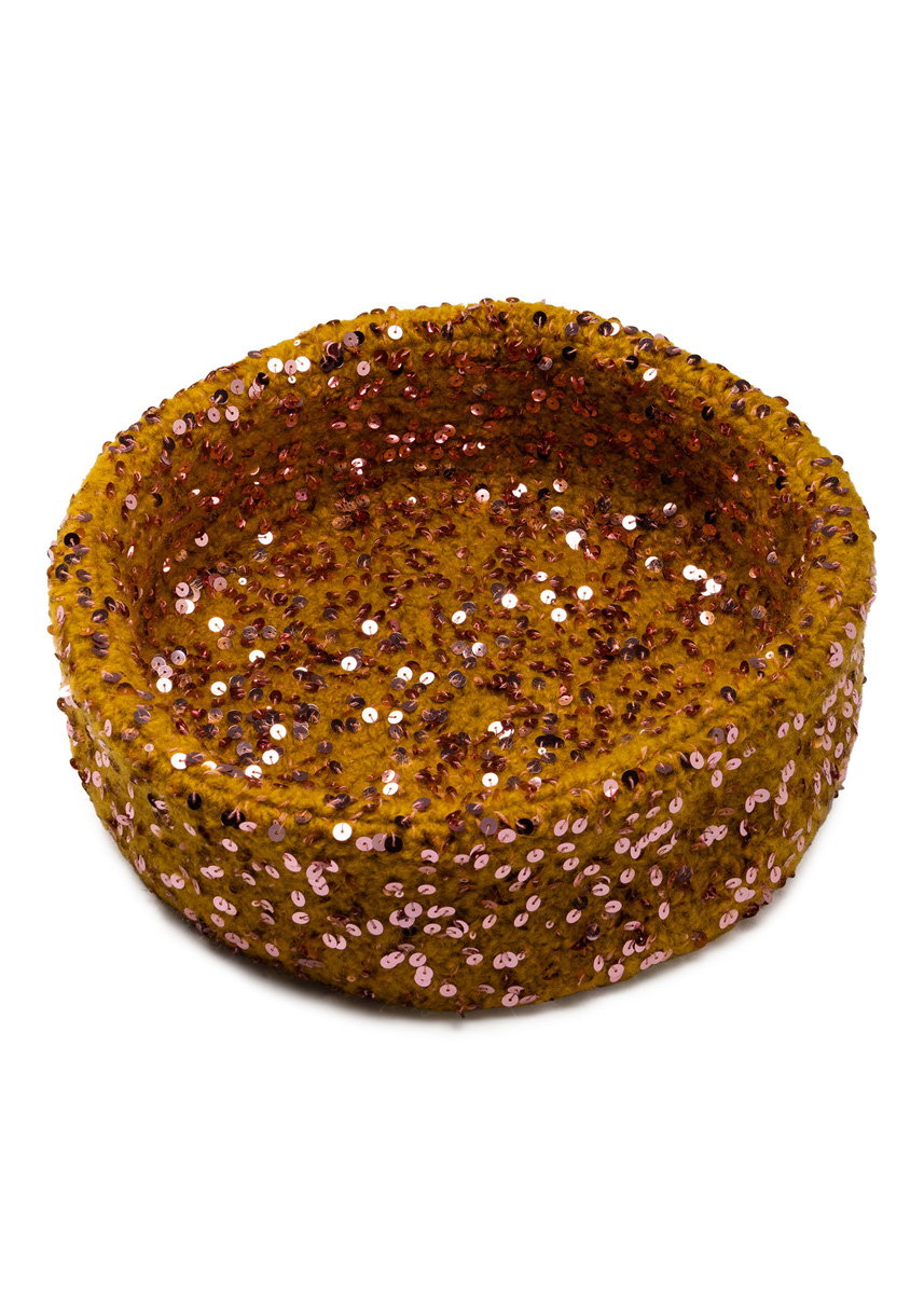 Lana Grossa-garen ‘Feltro’ (100% scheerwol, ca. 50 m/50 g): grote mand: ca. 700 g mosterd (kl 125) en Lana Grossa-garen ‘Cosmo’ (100% katoen (plus pailletten), ca. 260 m/100 g): grote en kleine mand: ca. 100 g oudroze (kl 14); 1 haaknld 7 mm.