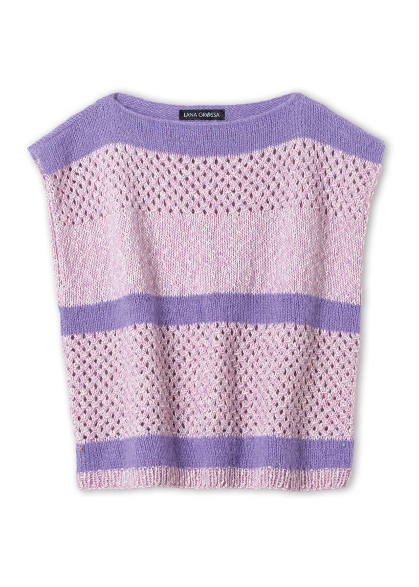 Lana Grossa-garen ‘Setasuri’ (69% alpaca (suri), 31% zijde, ca. 212 m/25 g): ca. 50 (50 - 50 - 75) g violet (kl 46); Lana Grossagaren ‘Bottoni’ (53% katoen, 24% viscose (merino), 23% scheerwol (merino extrafijn), ca. 125 m/50 g): ca. 200 (200 - 250 - 250) g sering/gebroken wit (kl 5); breinld 4,5 mm.