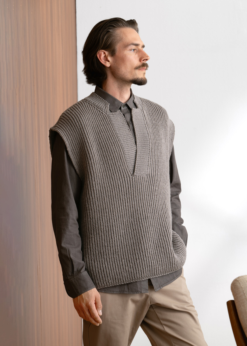 Lana Grossa Cool Wool Big (100% scheerwol (merino extrafijn), ca. 120 m/50 g), 700 (750 – 800) g taupe (kl 686); breinld 3,5 mm en 1 rondbreinld 3,5 mm (40 cm lang)