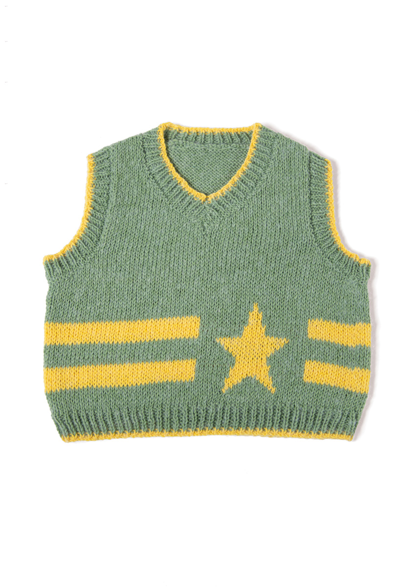 Lana Grossa Ecopuno (72% katoen, 17% scheerwol (merino), 11% alpaca (baby); ca. 215 m/50 g): 50 (50/100/100) g resedagroen (kl 20) en 50 g geel (kl 95); rondbreinld 3,5 mm en 4 mm; breinld zonder knop 3,5 mm; markeerringen.
