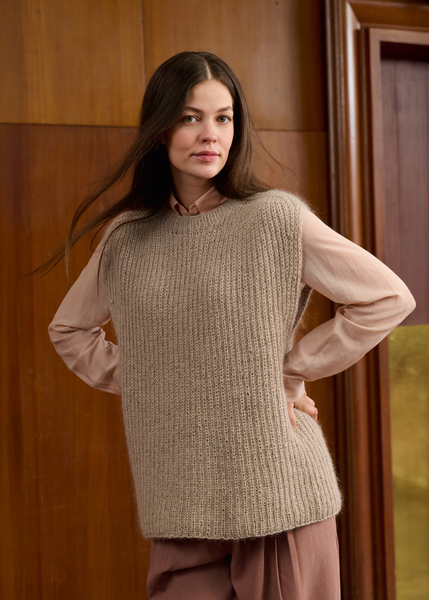 Lana Grossa Ecopuno (72% katoen, 17% scheerwol (merino), 11% alpaca (baby), ca. 215 m/50 g), 250 (300 – 350 – 400) g linnen beige (kl 222) en Lana Grossa Silkhair (70% mohair (superkid), 30% zijde, ca. 210 m/25 g), 125 (150 – 175 – 200) g beige (kl 220); 1 rondbreinld 4 mm, 40, 60 en 80 cm lang, 4 markeerringen.