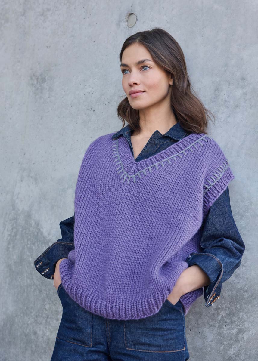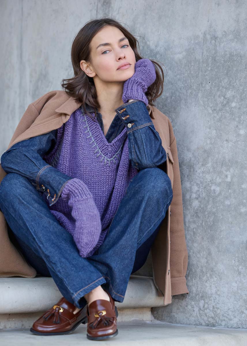 Lana Grossa-garen ‘Winter Softness’ (62% scheerwol (merino extrafijn), 38% katoen (bio), ca. 70 m/50 g): 350 (400 - 450 - 500) g violet (kl 8) en 50 g muisgrijs (kl 17); korte en lange rondbreinld 7 mm en 8 mm; 1 stompe borduurnaald.