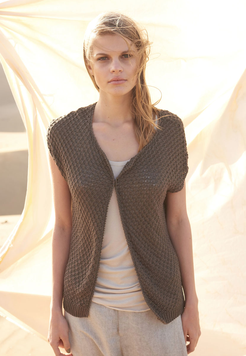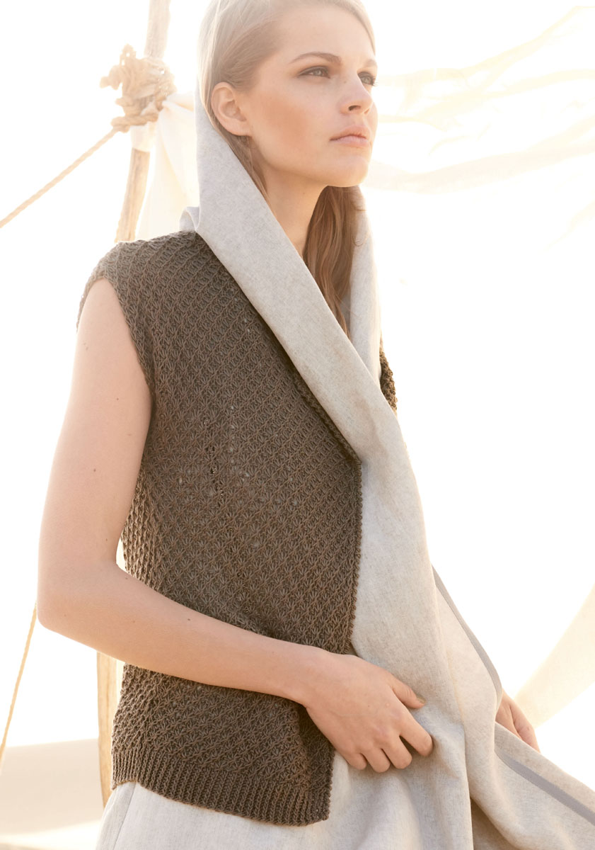„Solo Lino“ (80% gerecycled linnen (viscose), 20% linnen, looplengte 120 m/50 g) van Lana Grossa: 300 (350-350) g modderbruin (kl. 7); breinaalden nr. 3,5, 4,5 en 5,5; 1 haaknaald nr. 4,5