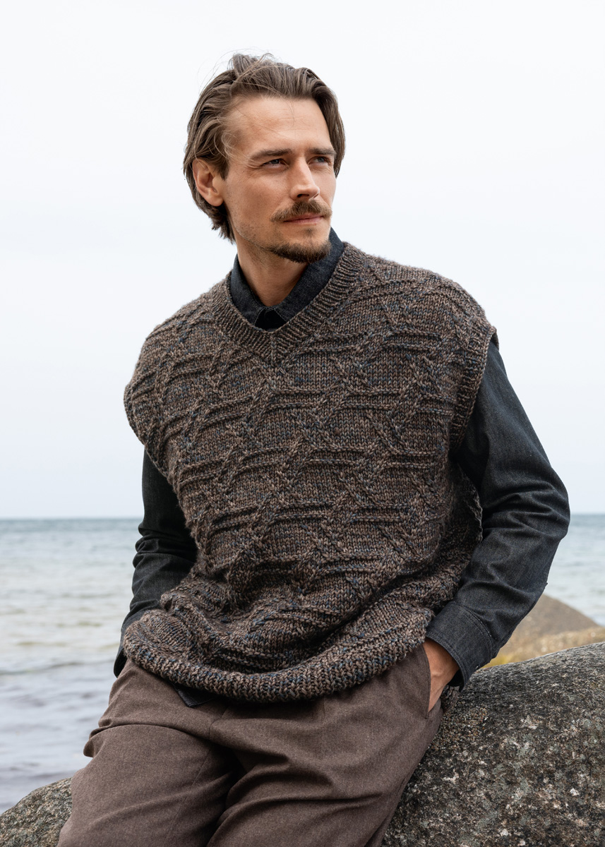 Lana Grossa Vintage Chunky (100% scheerwol (merino), ca. 80 m/50 g), 550 (650) g grijsbruin/donkergrijs (kl 12); breinld 4,5 mm en 5,5 mm, en 1 rondbreinld 4,5 mm (40 cm lang).