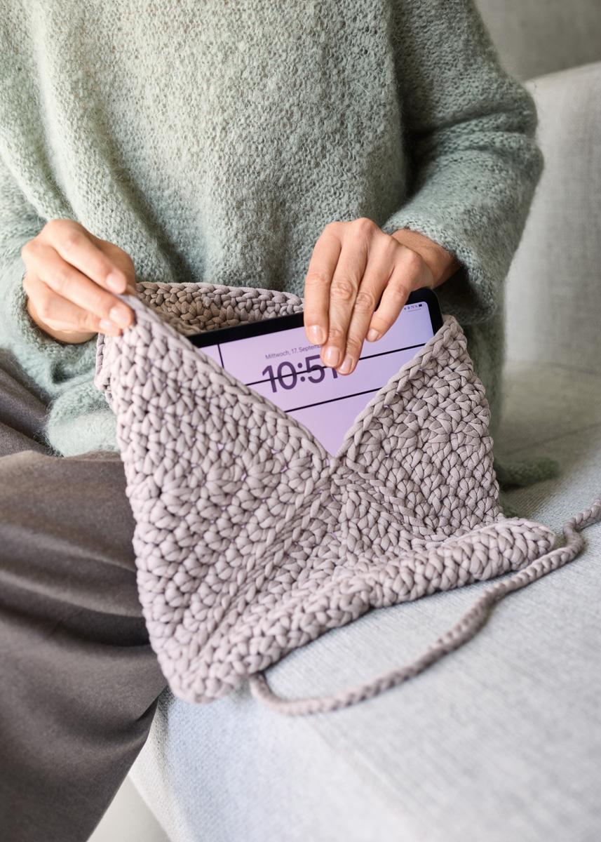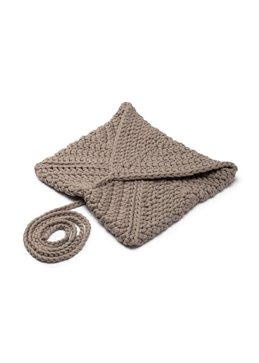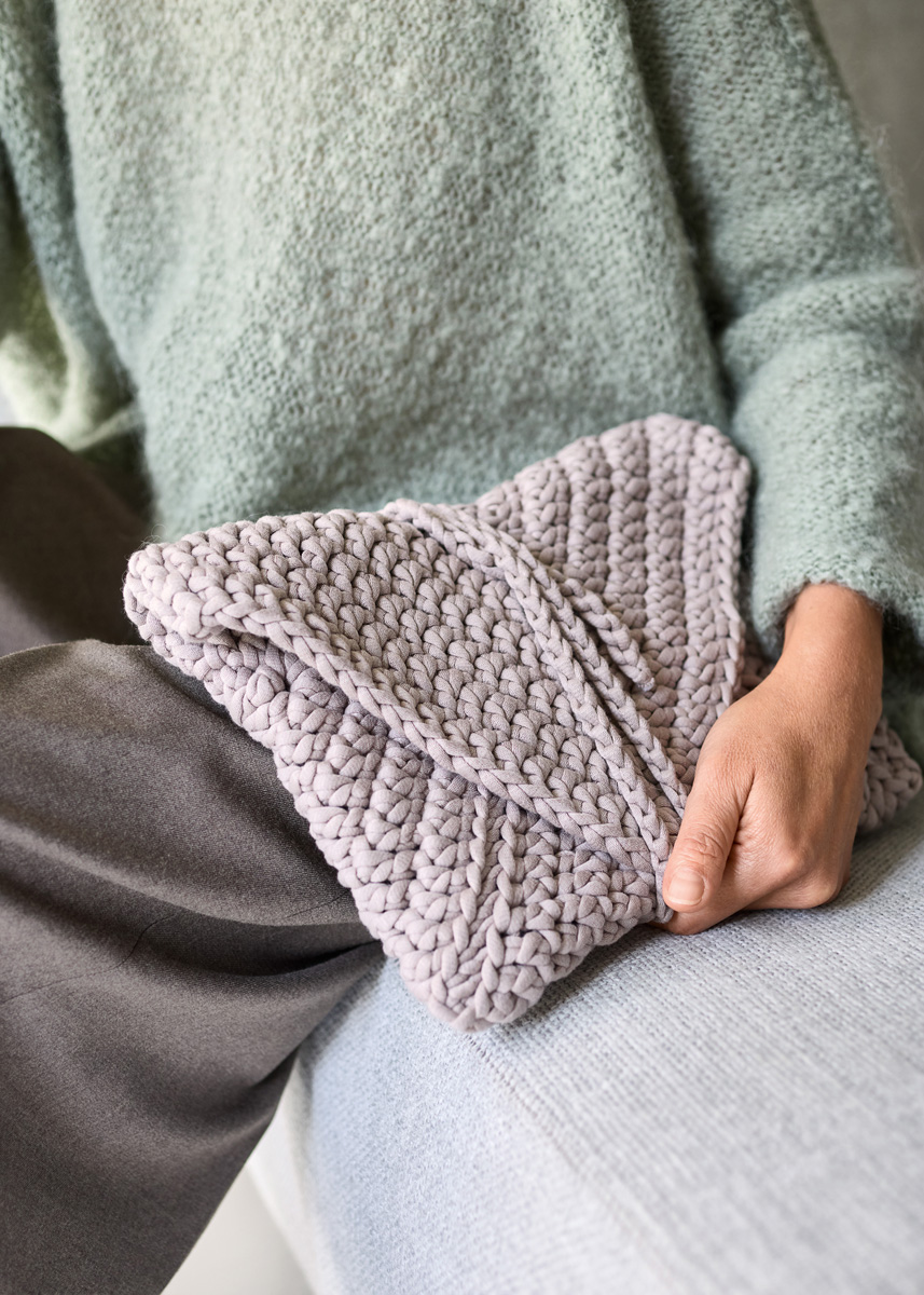 Lana Grossa-garen ‘The Tube’ (60% katoen, 40% nylon, ca. 114 m/200 g): ca. 400 g taupe (kl 23); 1 haaknld 9 mm, 1 borduurnaald van Lana Grossa.