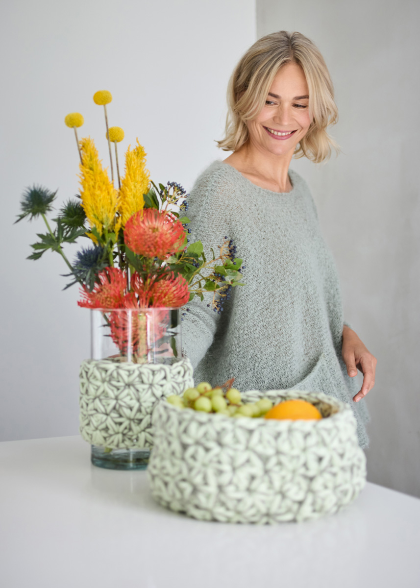 Lana Grossa-garen ‘The Tube’ (60% katoen, 40% nylon, ca. 114 m/200 g): ca. 200 g witgroen (kl 31) en Lana Grossa-garen ‘The Core’ (50% katoen, 50% polyester, ca. 85 m/100 g): ca. 200 g grijsgroen (kl 6); 1 haaknld 9 mm; een Glaszylinder, ø 15 cm, 25 cm hoog.