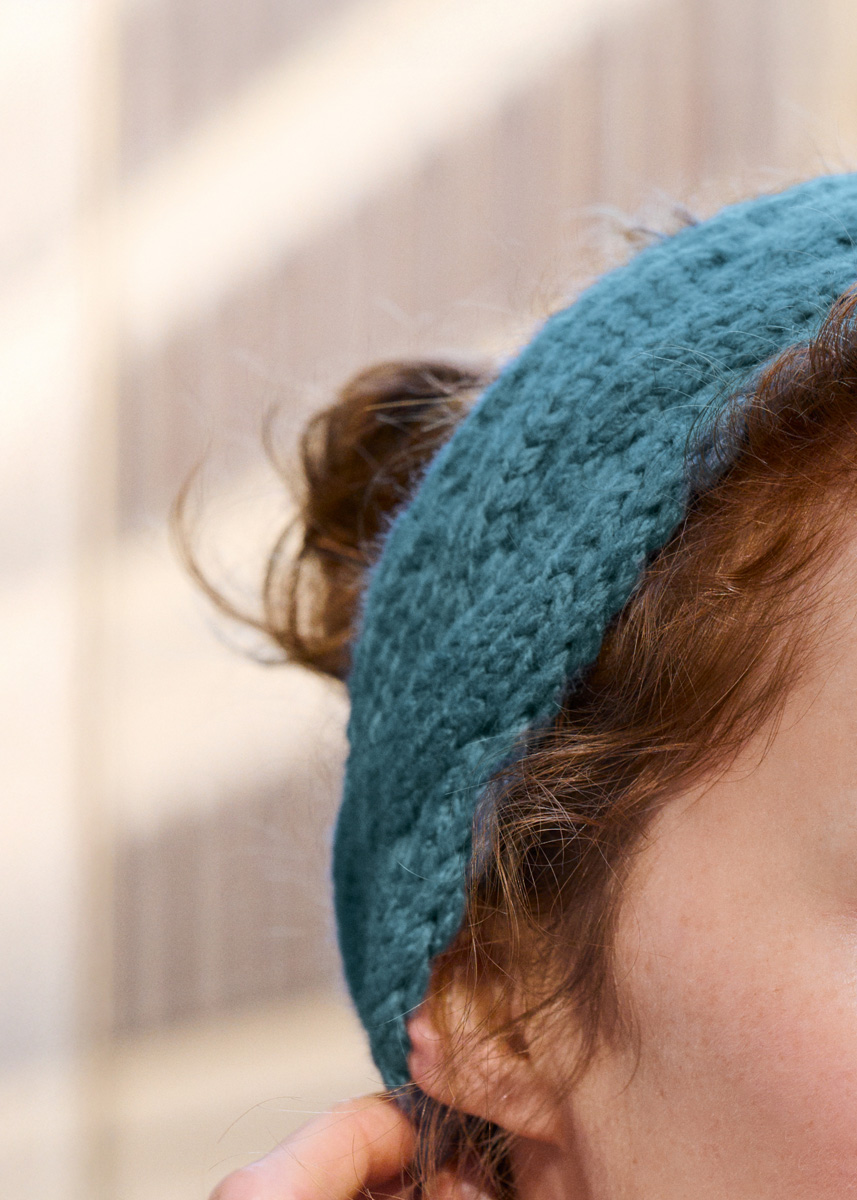 Lana Grossa-garen ‘Alta Moda Cashmere 16’ (78% scheerwol (merino), 12% kasjmier, 10% polyamide, ca. 110 m/50 g): ca. 50 g rookblauw (kl 53); breinld 6 mm; 1 kabelnaald.