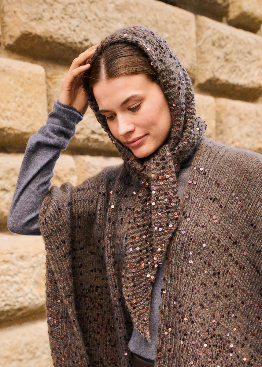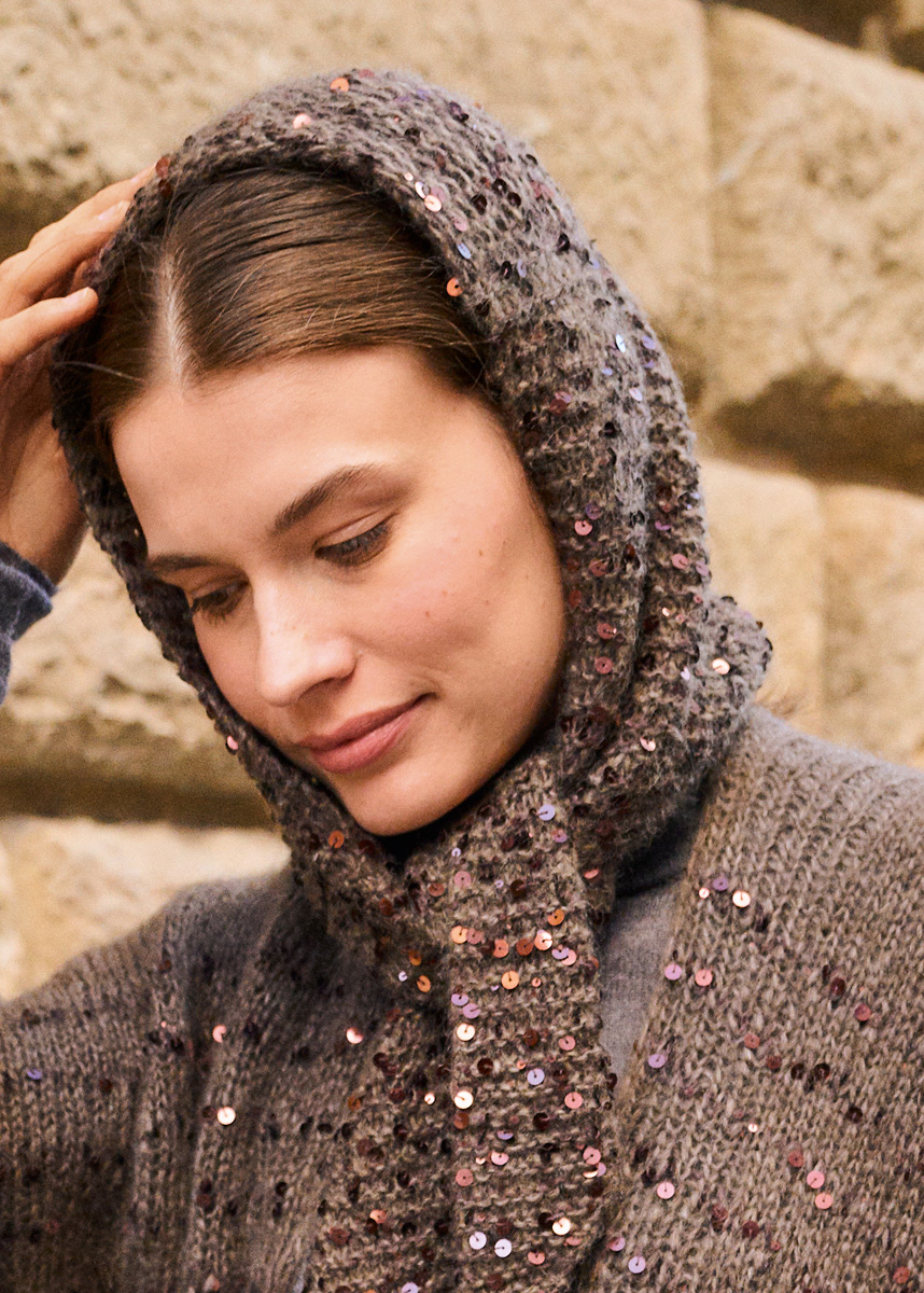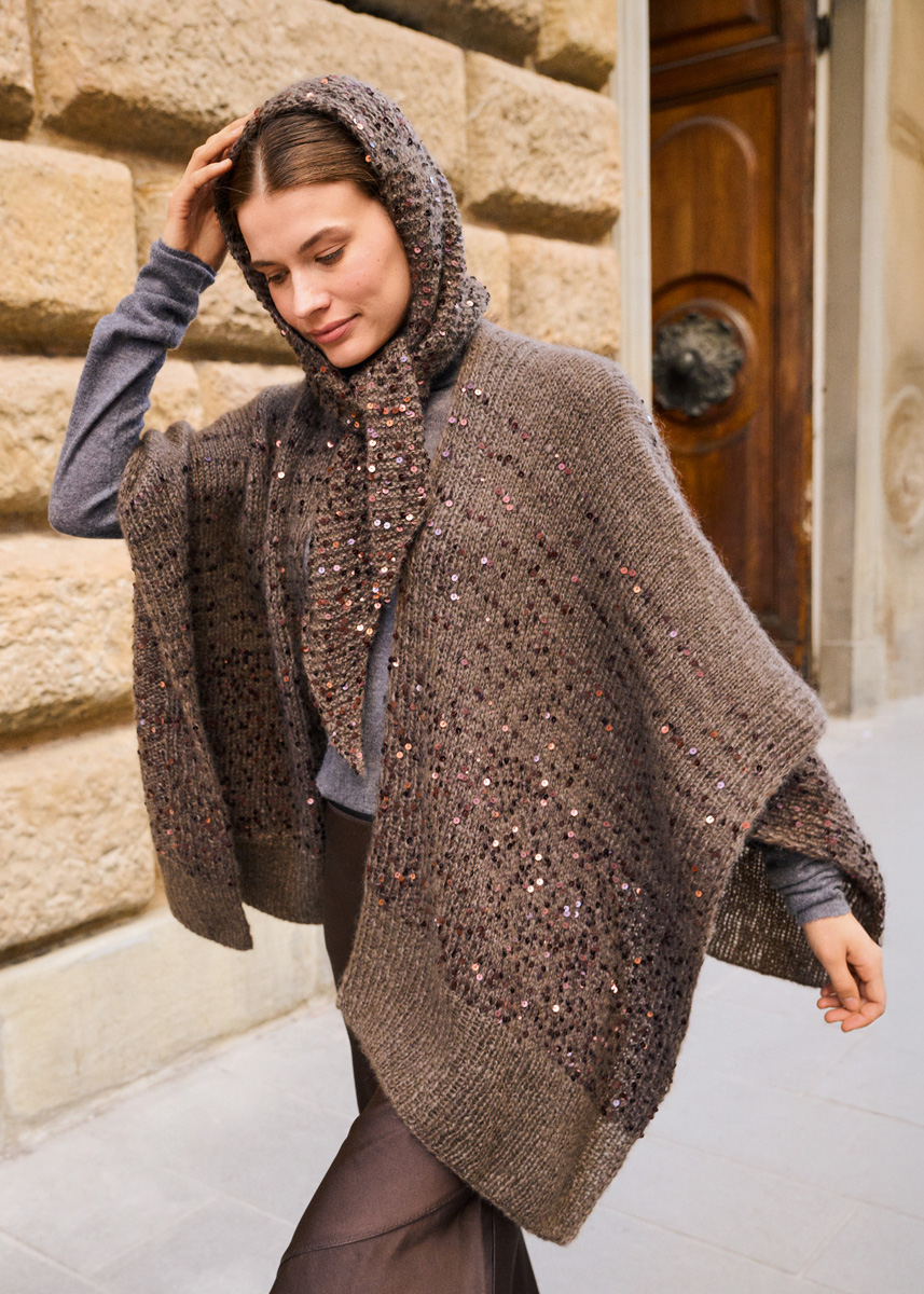 Lana Grossa-garen ‘Superkid Seta’ (65% mohair (superkid), 35% zijde, ca. 100 m/25 g): ca. 100 g grijsbruin (kl 26); Lana Grossa-garen ‘Cosmo’ (100% katoen met pailletten, ca. 260 m/100 g): 100 g mokka (kl 6); breinld 6 mm; markeerringen.