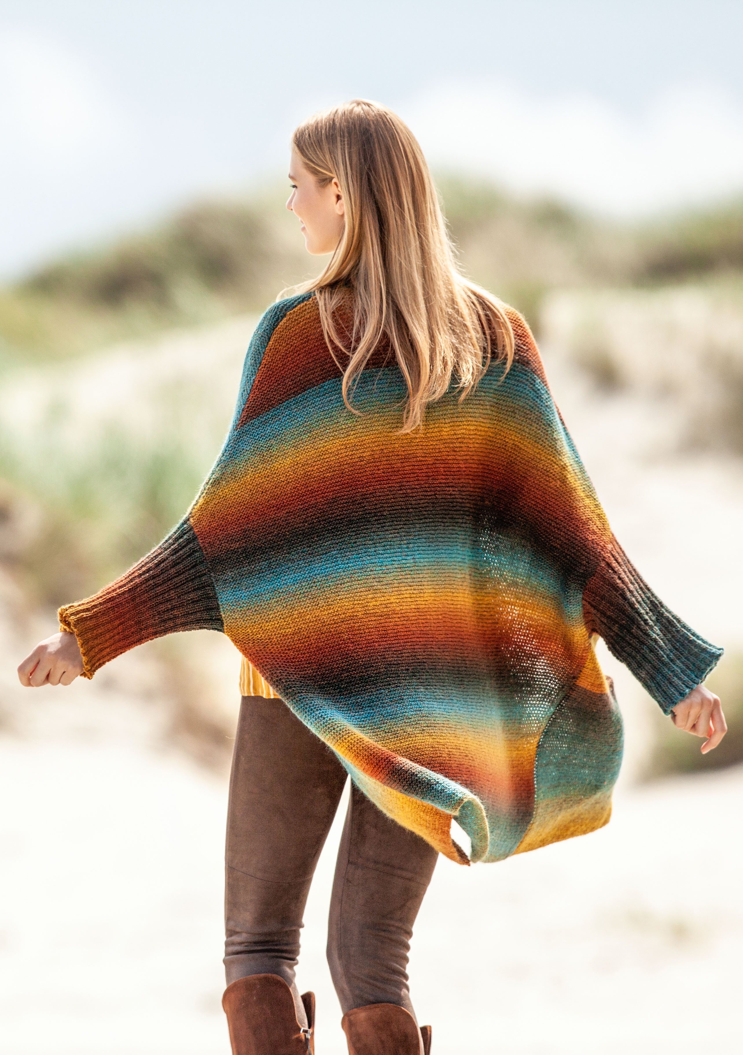 Lana Grossa Gomitolo Versione (60 % Scheerwol, 40 % Polyacryl, Looplengte 700 m/200 gr.) 600 (600 – 800) gr. oker/roodbruin/mosterd/petrol (kl. 407); breinaalden nr. 3,5 en 4