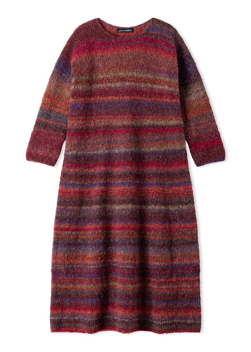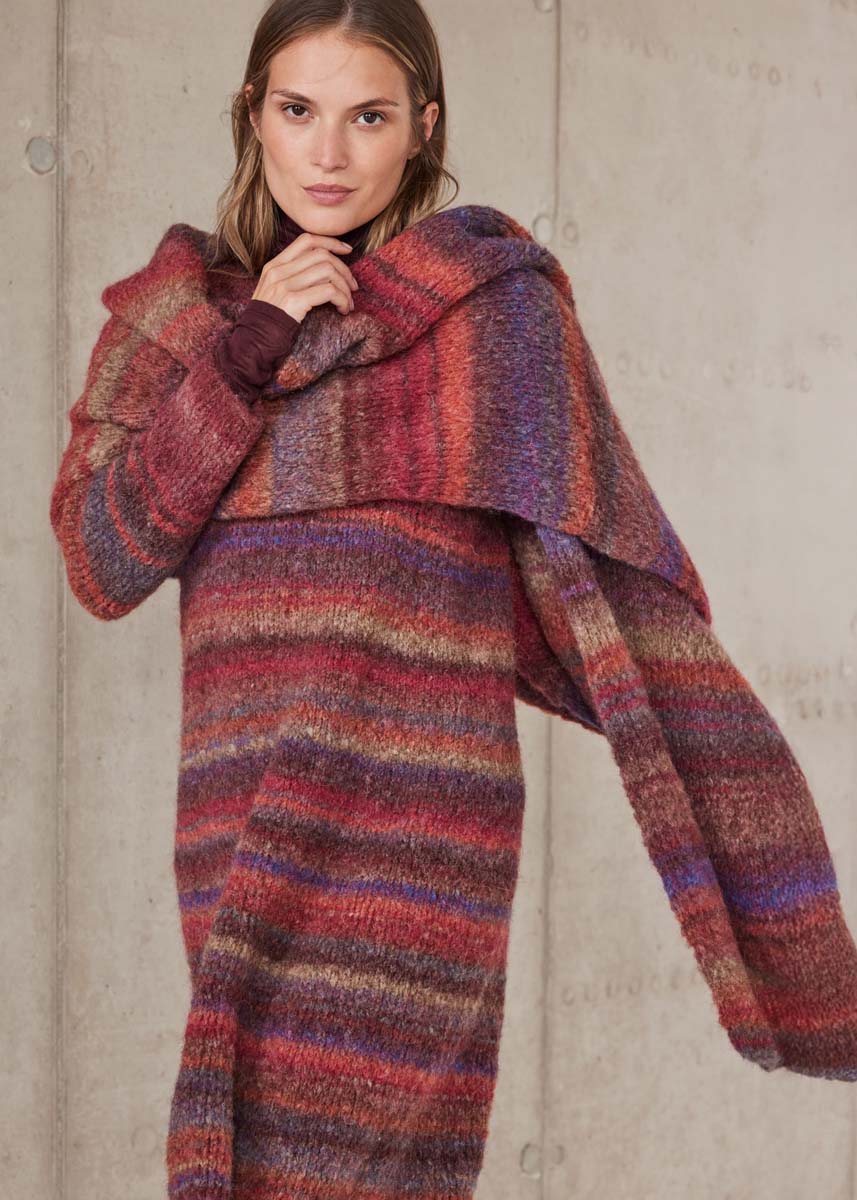 Lana Grossa Gigante Multi (70% alpaca (fijn), 30% polyamide, ca. 150 m/50 g), 450 (500) g wijnrood/roodbruin/ grijsrot/aubergine/kaki/grijsbruin (kl 103); 1 rondbreinld 4 mm, 60 cm en 100 cm lang; 1 rondbreinld 4,5 mm, 100 cm lang; 1 setje breinld zonder knop 4 mm; 1 markeerringen