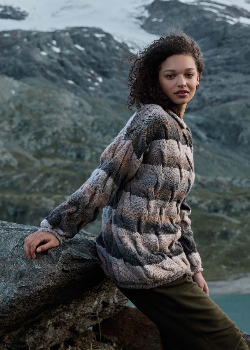 Gomitolo Fumo van Lana Grossa (50% scheerwol, 50% polyacryl, LL=ca 700 m/200 g): 2 (3) klw. = ca 400 (600) g zacht-/licht-/middel-/donkergrijs/grège/antraciet (kl. 518). Breinld.nr. 4,5 en 5. Korte rondbreinld. nr. 4,5. Kabelnld.