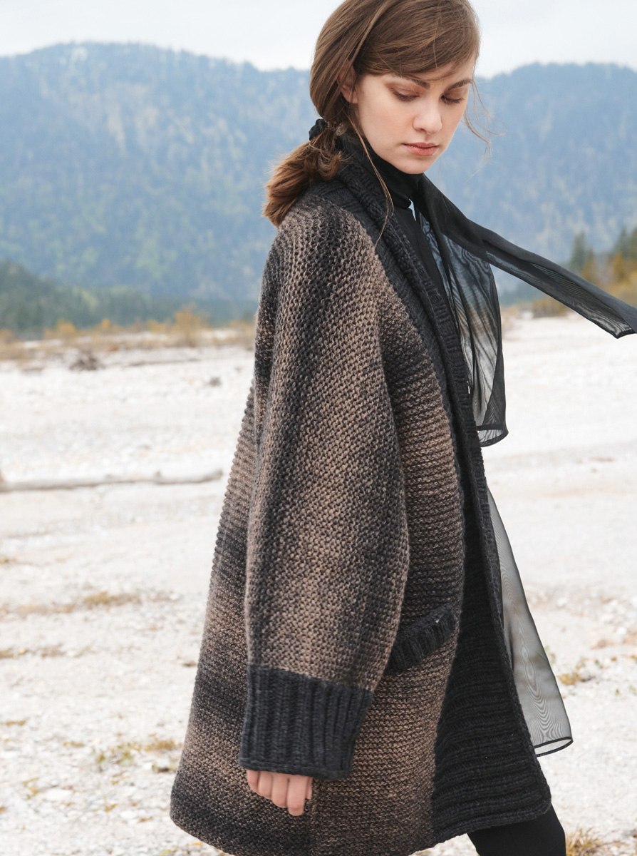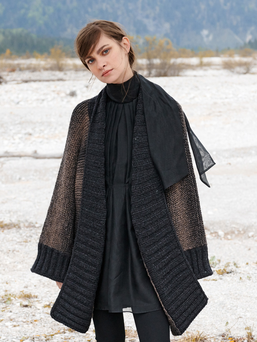 Lana Grossa Alta Moda Cashmere 16 Sfumato (78% merinosscheerwol, 12% kasjmier, 10% polyamide, looplengte 220 m/100 g), 600 (650 – 700 – 750) g grijsbruin gemêleerd (kl. 209) en Lana Grossa Alta Moda Cashmere 16 (78% merinosscheerwol, 12% kasjmier, 10% polyamide, looplengte 110 m/50 g), 250 g antraciet (kl. 14); 2 rondbreinaalden nr. 8, 80 cm lang