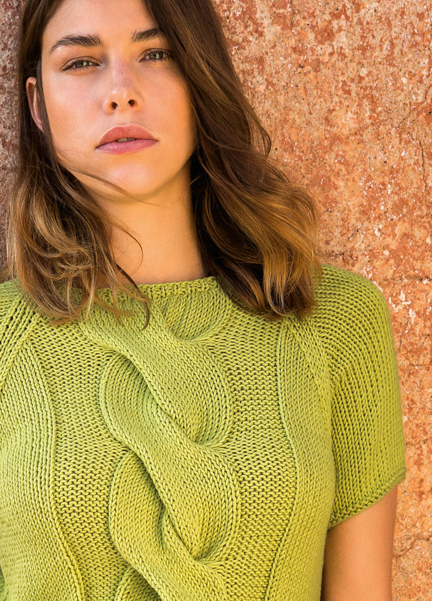 „Organico“ (100% bio katoen, looplengte = ca. 90 m/50 g) van Lana Grossa: ca. 300 (350) g geelgroen (kl. 91); breinaalden nr. 4,5 en 5,5; 1 rondbreinaald nr. 4,5, 40 cm lang