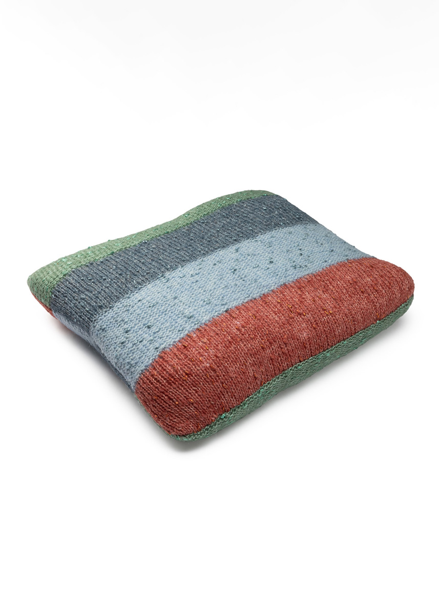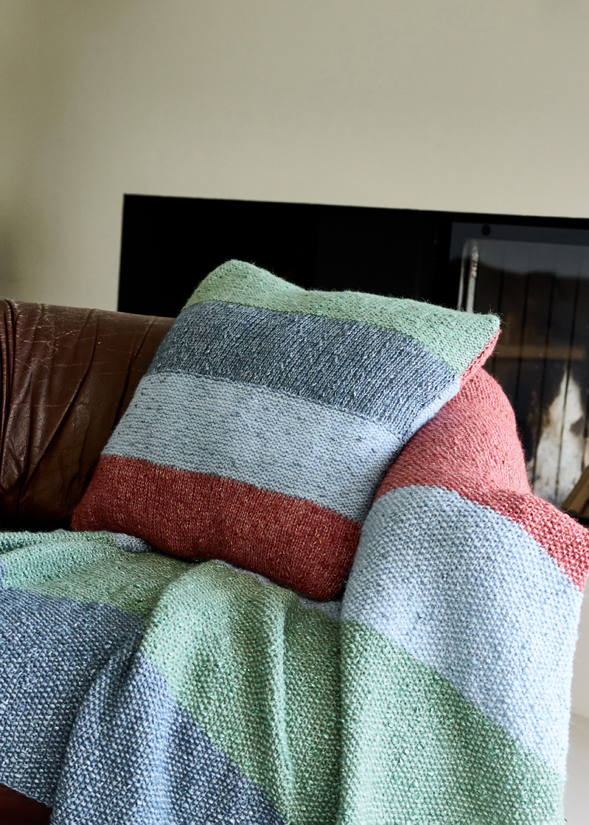 Lana Grossa-garen ‘Lucciola’ (29% polyamide, 24% scheerwol (merino Fine), 22% viscose, 20% (baby) alpaca, 5% metaalvezels, ca. 130 m/50 g): ca. 50 g groen (kl 3), grijsblauw (kl 4), lichtblauw (kl 5) en terracotta (kl 9); breinld 5 mm; 1 wasbare kussenvulling, 45x 45 cm