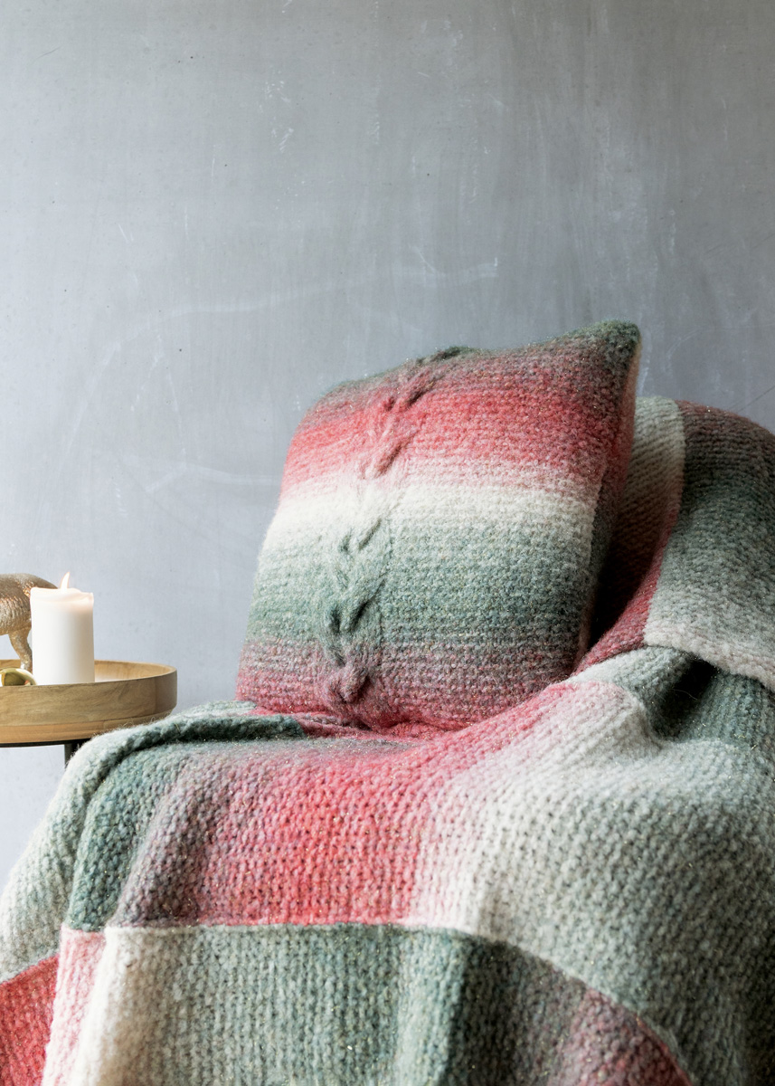 Lana Grossa-garen Christmas Edition Gigante Lurex (70% alpaca (fijn), 30% polyamide, ca. 150 m/50 g): 150 g rood/groen/wit (kl 999); breinld 6 mm; 1 kabelnaald; 1 wasbare kussenvulling 50 x 50 cm.