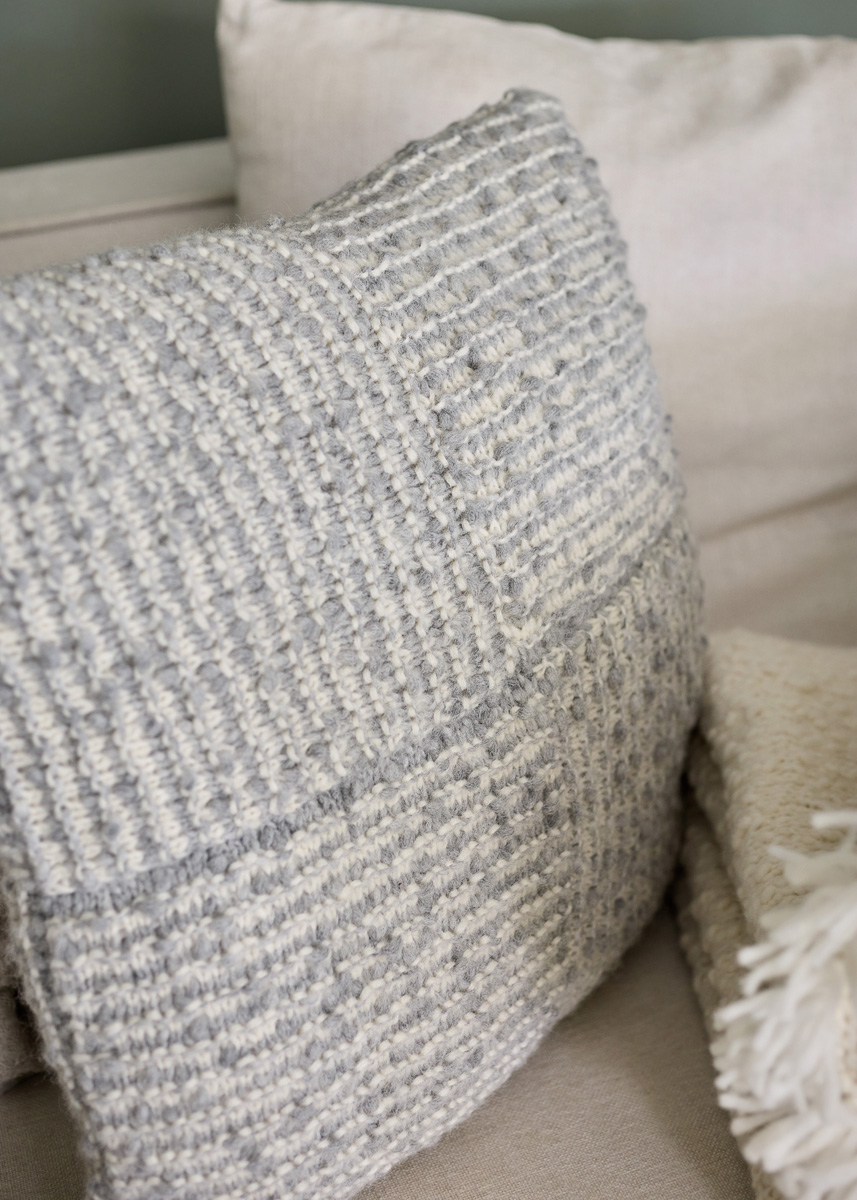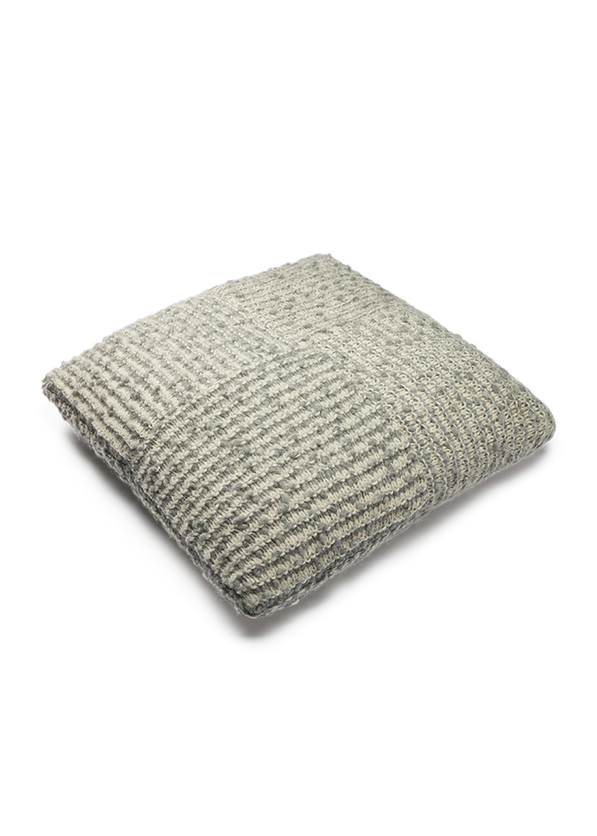 Lana Grossa-garen ‘Caramella’ (53% scheerwol (merino), 25% (baby) alpaca, 22% polyamide, ca. 110 m/50 g): ca. 150 g lichtgrijs (kl 12) en Lana Grossa-garen ‘Brigitte No. 2’ (47% (baby) alpaca, 45% katoen, 8% scheerwol (merino), ca. 140 m/50 g): ca. 100 g gebroken wit (kl 16); breinld 4 mm; 1 wasbare kussenvulling, 50 x 50 cm.