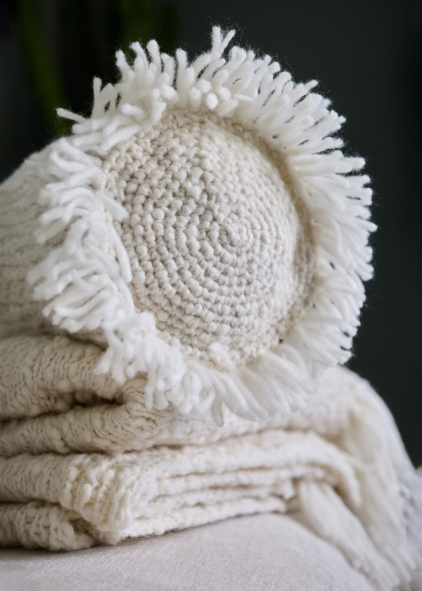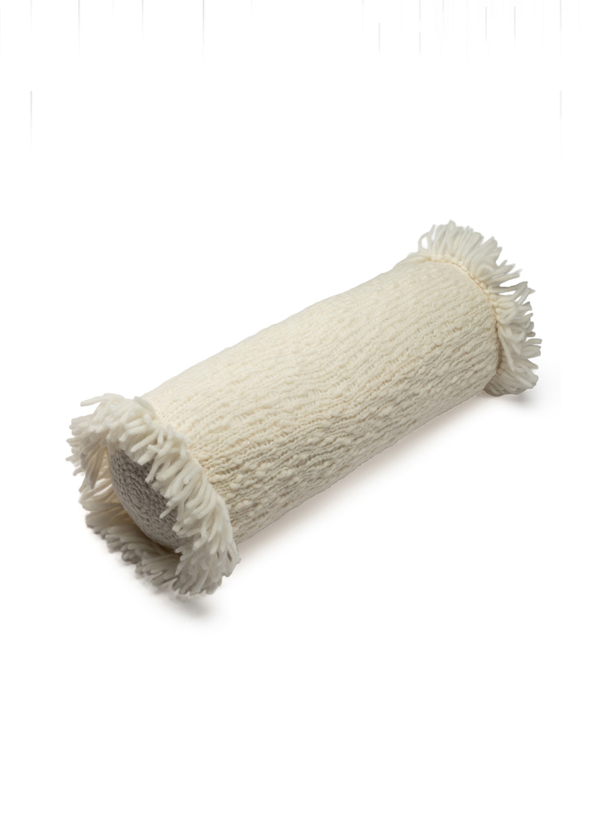 Lana Grossa-garen ‘Caramella’ (53% scheerwol (merino), 25% (baby) alpaca, 22% polyamide, ca. 110 m/50 g): ca. 150 g lichtgrijs (kl 12) en Lana Grossa-garen ‘Brigitte No. 2’ (47% (baby) alpaca, 45% katoen, 8% scheerwol (merino), ca. 140 m/50 g): ca. 100 g gebroken wit (kl 16); breinld 4 mm; 1 wasbare kussenvulling, 50 x 50 cm.