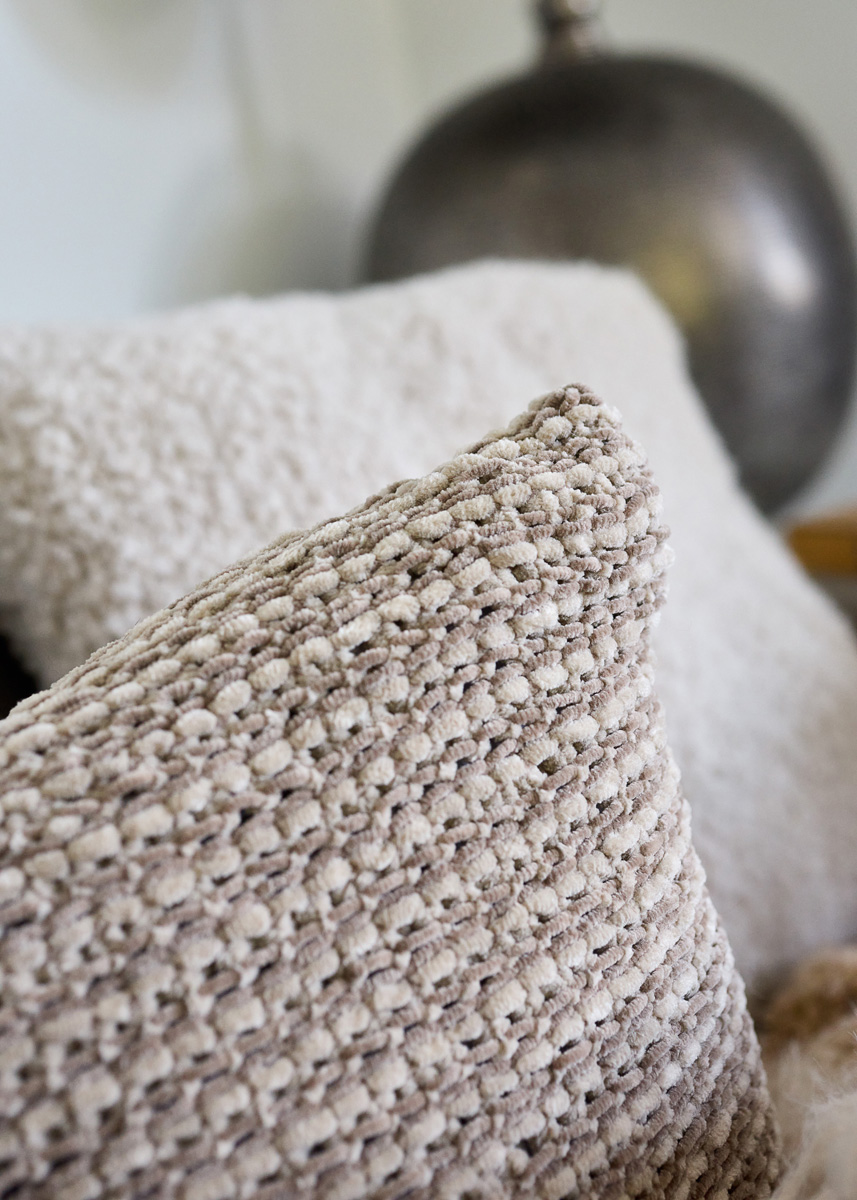 Lana Grossa-garen ‘The Look’ (100% polyester, ca. 120 m/100 g): kussenhoes B: ca. 100 g beige (kl 23) en Lana Grossa- garen ‘The Look Fine’ (100% polyester, ca. 100 m/50 g): kussenhoes B: ca. 100 g beige (kl 124); breinld 6 mm; wasbare kussenvulling, 40 x 40 cm